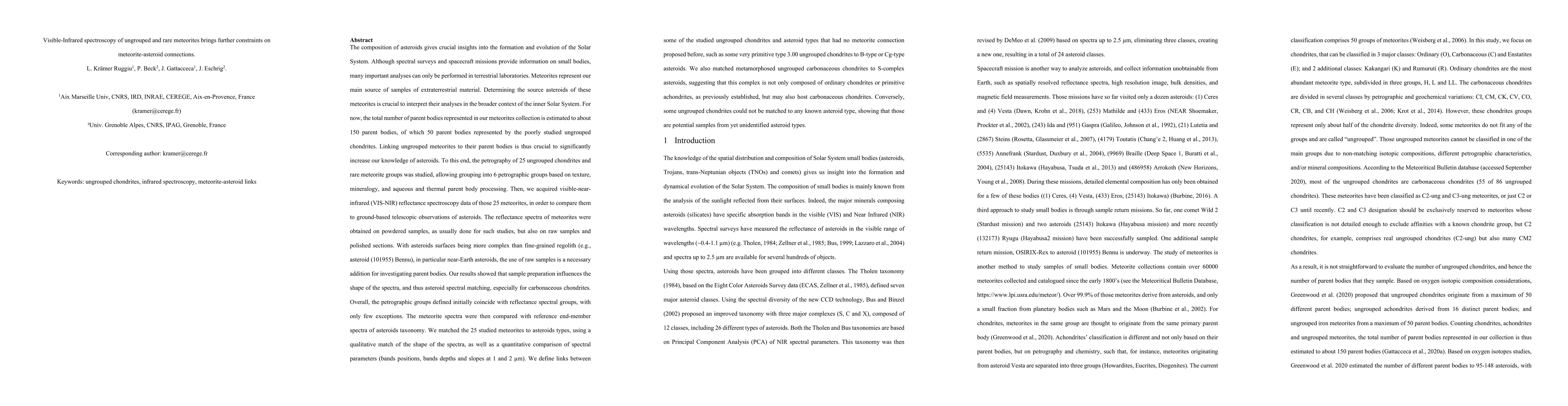 This study uses visible-infrared spectroscopy to analyze ungrouped chondrites and rare meteorites, revealing new connections between these meteorites and specific asteroid types, including previously unlinked primitive type 3.00 chondrites to B-type or Cg-type asteroids. The research highlights the influence of sample preparation on spectral data and suggests that the S-complex asteroids may include carbonaceous chondrites, expanding beyond ordinary chondrites and primitive achondrites.