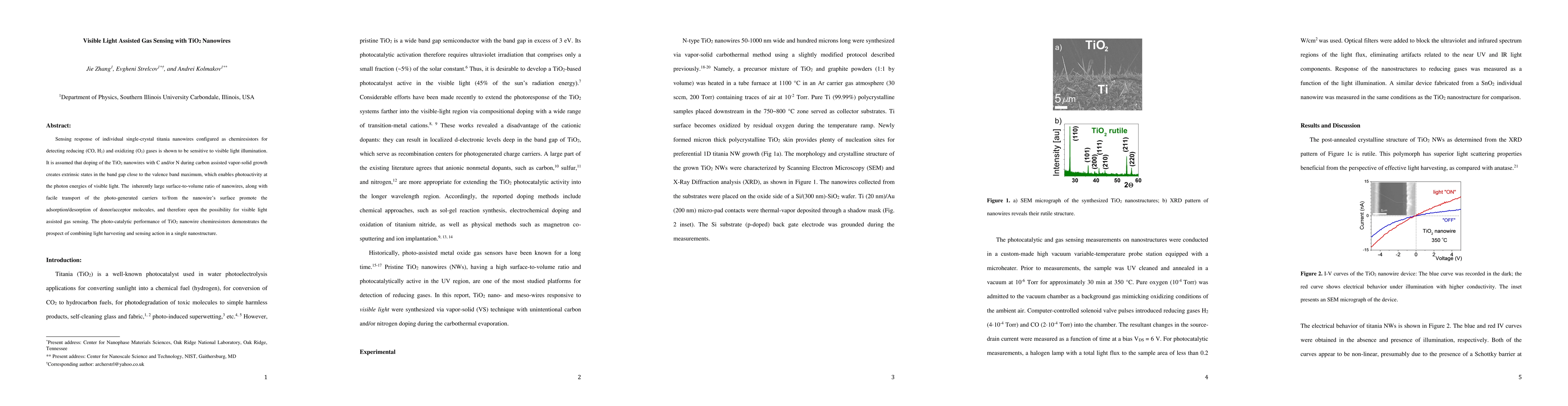 Sensing response of individual single-crystal titania nanowires configured as chemiresistors for detecting reducing (CO, H2) and oxidizing (O2) gases is shown to be sensitive to visible light illumination. It is assumed that doping of the TiO2 nanowires with C and/or N during carbon assisted vapor-solid growth creates extrinsic states in the band gap close to the valence band maximum, which enables photoactivity at the photon energies of visible light. The inherently large surface-to-volume ratio of nanowires, along with facile transport of the photo-generated carriers to/from the nanowires surface promote the adsorption/desorption of donor/acceptor molecules, and therefore open the possibility for visible light assisted gas sensing. The photo-catalytic performance of TiO2 nanowire chemiresistors demonstrates the prospect of combining light harvesting and sensing action in a single nanostructure.