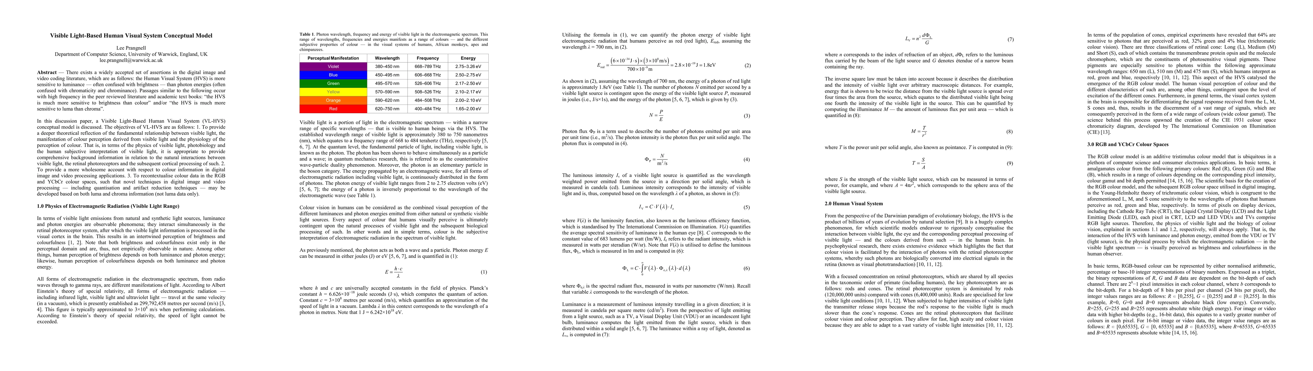 There exists a widely accepted set of assertions in the digital image and video coding literature, which are as follows: the Human Visual System (HVS) is more sensitive to luminance (often confused with brightness) than photon energies (often confused with chromaticity and chrominance). Passages similar to the following occur with high frequency in the peer reviewed literature and academic text books: "the HVS is much more sensitive to brightness than colour" and/or "the HVS is much more sensitive to luma than chroma". In this discussion paper, a Visible Light-Based Human Visual System (VL-HVS) conceptual model is discussed. The objectives of VL-HVS are as follows: 1. To provide a deeper theoretical reflection of the fundamental relationship between visible light, the manifestation of colour perception derived from visible light and the physiology of the perception of colour. That is, in terms of the physics of visible light, photobiology and the human subjective interpretation of visible light, it is appropriate to provide comprehensive background information in relation to the natural interactions between visible light, the retinal photoreceptors and the subsequent cortical processing of such. 2. To provide a more wholesome account with respect to colour information in digital image and video processing applications. 3. To recontextualise colour data in the RGB and YCbCr colour spaces, such that novel techniques in digital image and video processing, including quantisation and artifact reduction techniques, may be developed based on both luma and chroma information (not luma data only).