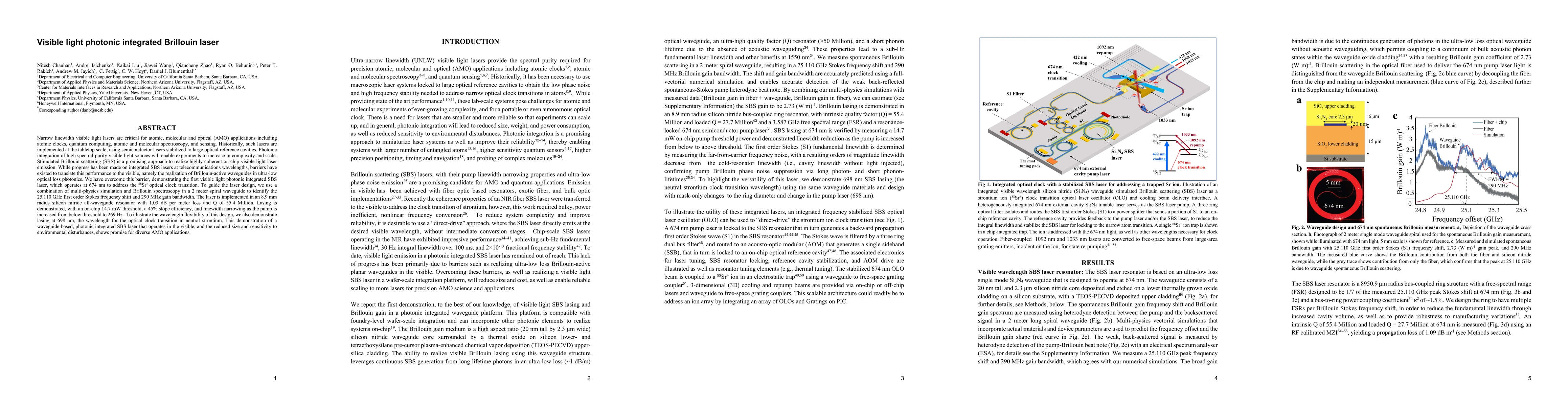 The paper presents the first integrated visible light Brillouin laser, utilizing ultra-low loss optical waveguiding and short phonon lifetime to achieve lasing in the visible spectrum.