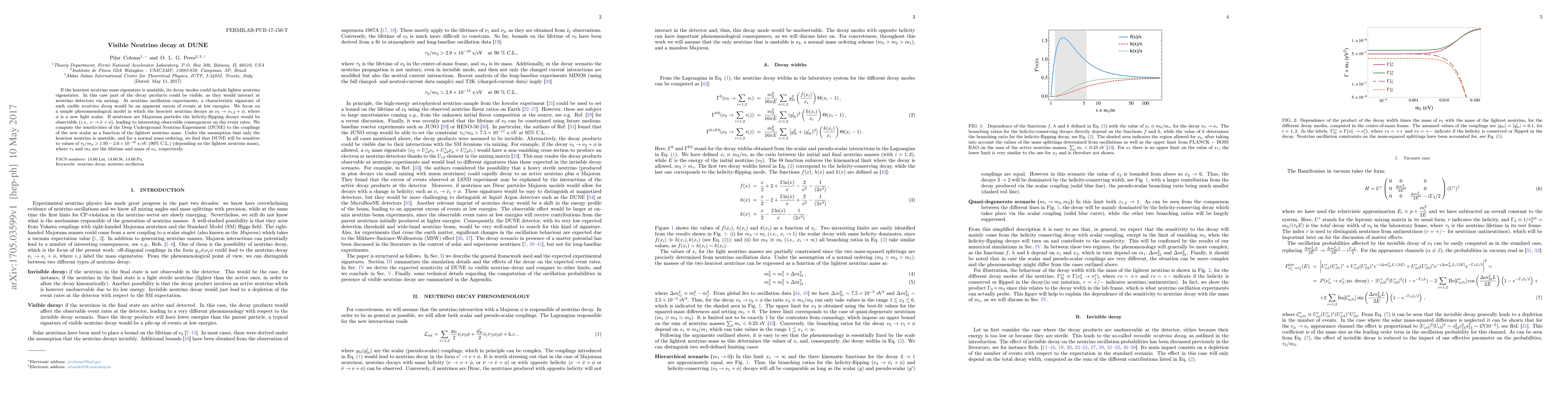 This paper investigates the potential for observing visible decay of the heaviest neutrino ($\nu_3$) into lighter neutrinos and a new light scalar ($\phi$) at the Deep Underground Neutrino Experiment (DUNE). It finds that DUNE could detect such decay if the heaviest neutrino is unstable, with sensitivities depending on the lightest neutrino mass, ranging from $\tau_3/m_3 > 1.95 - 2.6\times 10^{-10}$~s/eV (90\% C.L.).