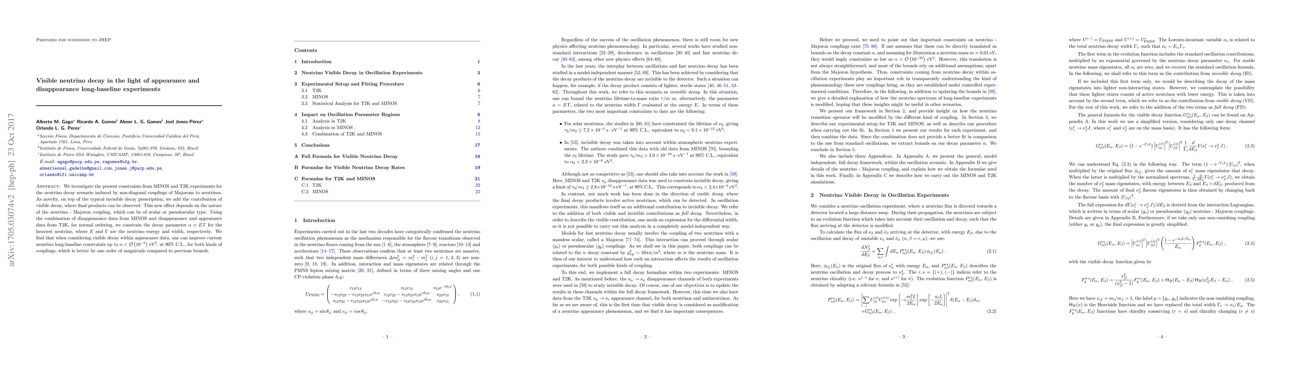 We investigate the present constraints from MINOS and T2K experiments for the neutrino decay scenario induced by non-diagonal couplings of Majorons to neutrinos. As novelty, on top of the typical invisible decay prescription, we add the contribution of visible decay, where final products can be observed. This new effect depends on the nature of the neutrino - Majoron coupling, which can be of scalar or pseudoscalar type. Using the combination of disappearance data from MINOS and disappearance and appearance data from T2K, for normal ordering, we constrain the decay parameter $\alpha\equiv E\,\Gamma$ for the heaviest neutrino, where $E$ and $\Gamma$ are the neutrino energy and width, respectively. We find that when considering visible decay within appearance data, one can improve current neutrino long-baseline constraints up to $\alpha< \mathcal{O}(10^{-5})$ eV$^2$, at 90\% C.L., for both kinds of couplings, which is better by one order of magnitude compared to previous bounds.