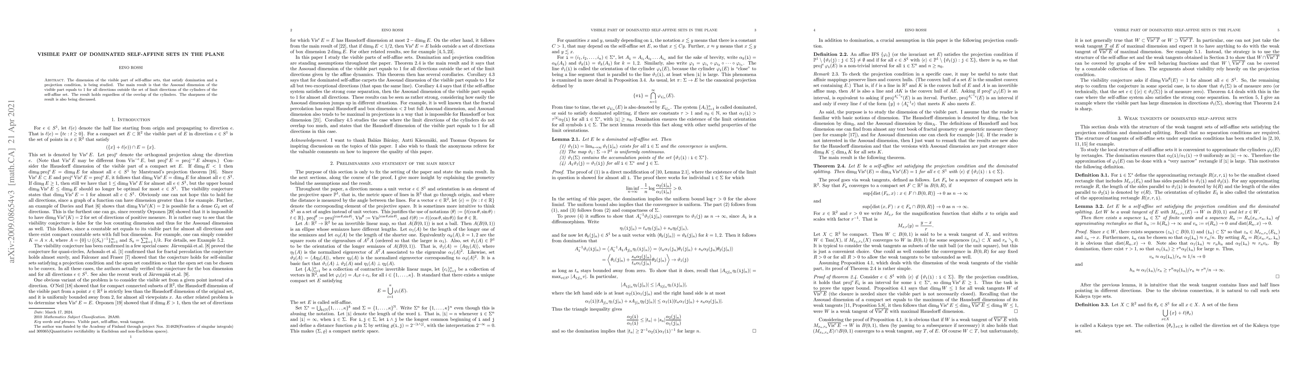 The dimension of the visible part of self-affine sets, that satisfy domination and a projection condition, is being studied. The main result is that the assouad dimension of the visible part equals to 1 for all directions outside the set of limit directions of the cylinders of the self-affine set. The result holds regardless of the overlap of the cylinders. The sharpness of the result is also being discussed.
