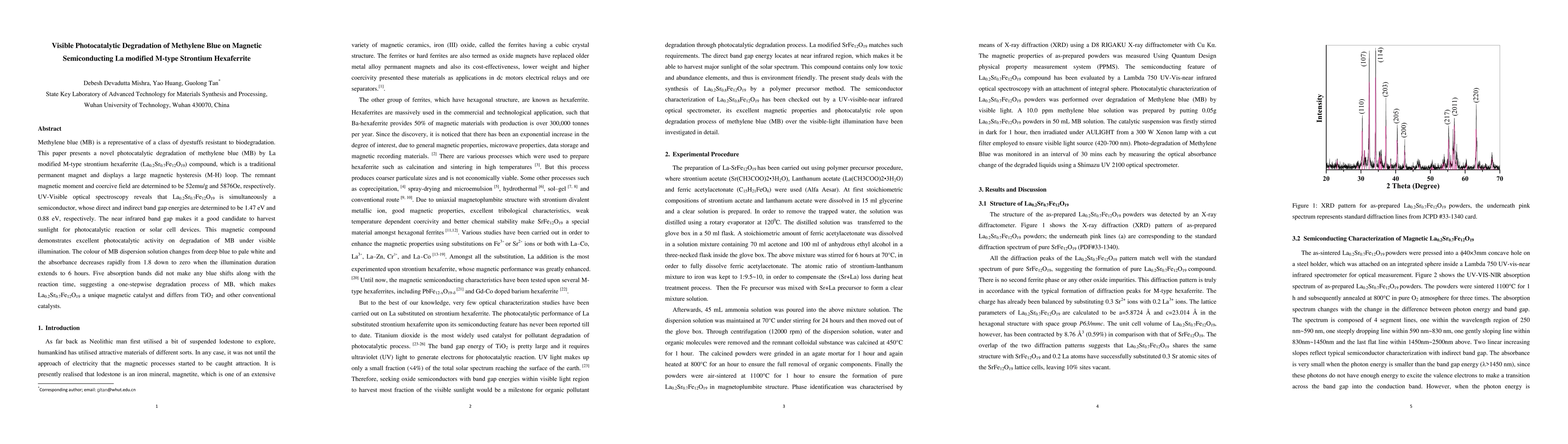 This study investigates the visible photocatalytic degradation of methylene blue (MB) using La modified M-type strontium hexaferrite (La0.2Sr0.7Fe12O19), a magnetic semiconductor with a direct band gap of 1.47 eV. The compound demonstrates superior photocatalytic efficiency under visible light, resulting in complete MB degradation within 6 hours, indicating a unique one-step degradation process.