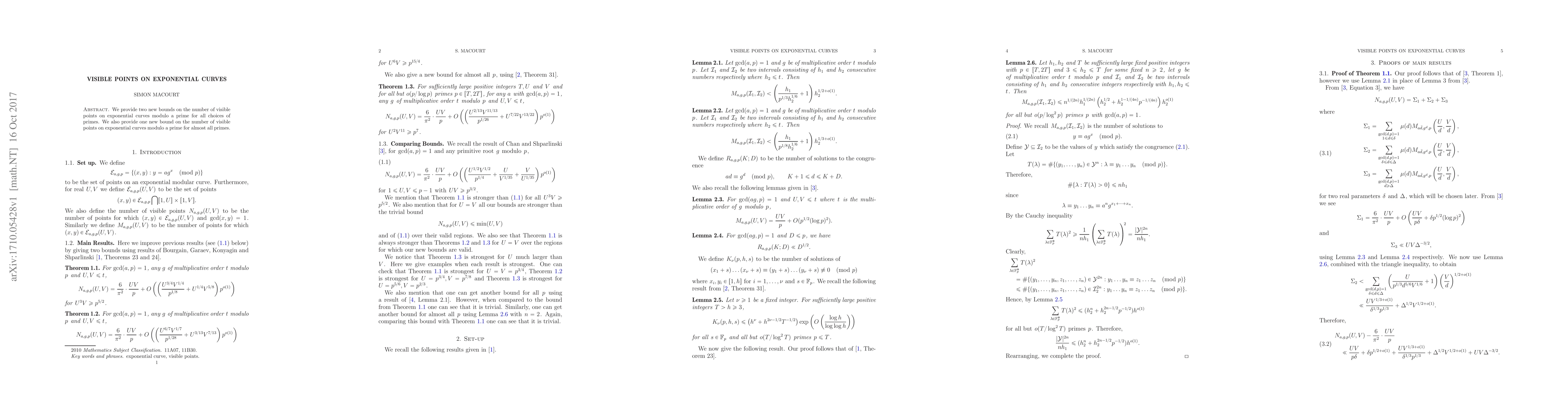 Summary: This paper presents new bounds on the number of visible points on exponential curves when taken modulo a prime for all primes and a specific bound for almost all primes. The results enhance the understanding of the visibility properties of these curves in modular arithmetic.