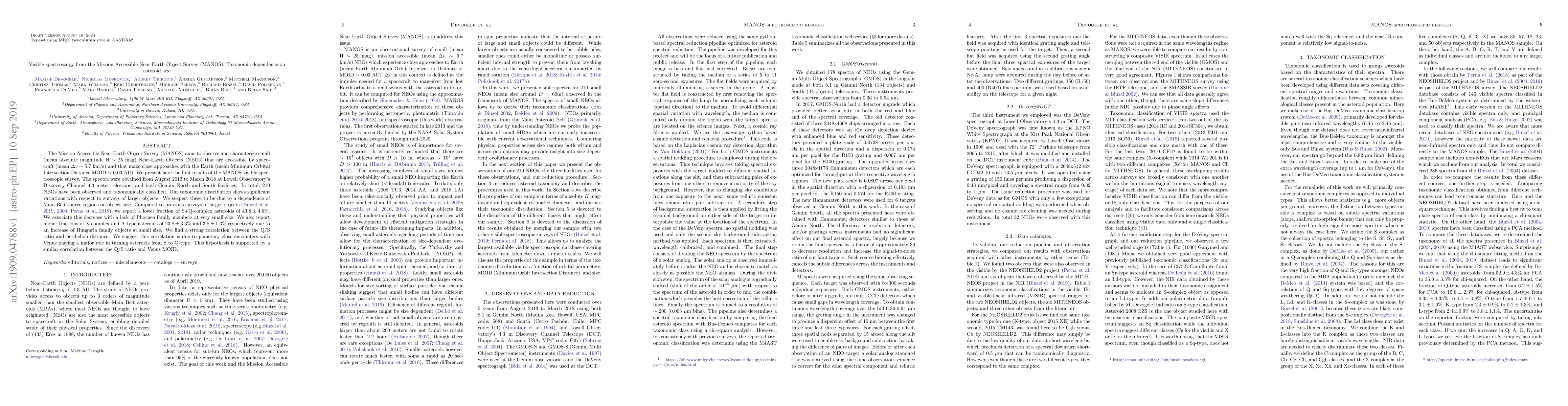 The MANOS visible spectroscopic survey reveals significant taxonomic variations in small Near-Earth Objects (NEOs) compared to larger objects, with a lower fraction of S+Q-complex asteroids and higher fractions of X-complex and A-type asteroids, suggesting a size-dependent Main Belt source region.