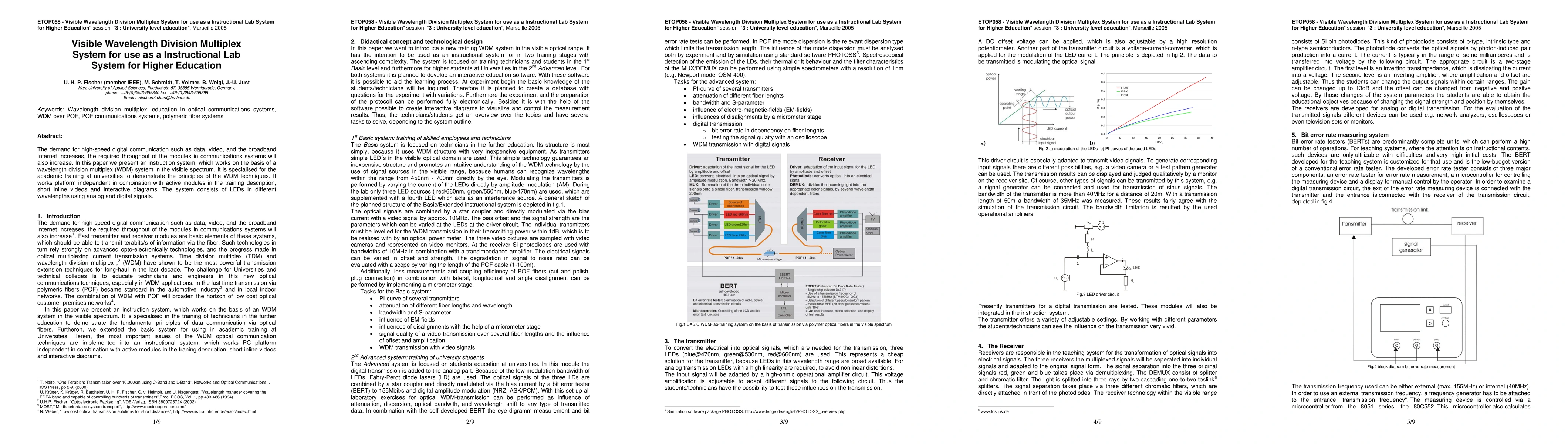 This paper introduces a visible wavelength division multiplex (WDM) system for higher education labs, demonstrating WDM principles through LEDs emitting different wavelengths for analog and digital signals, combined with interactive training materials. The system aims to enhance academic training in high-speed digital communication techniques.