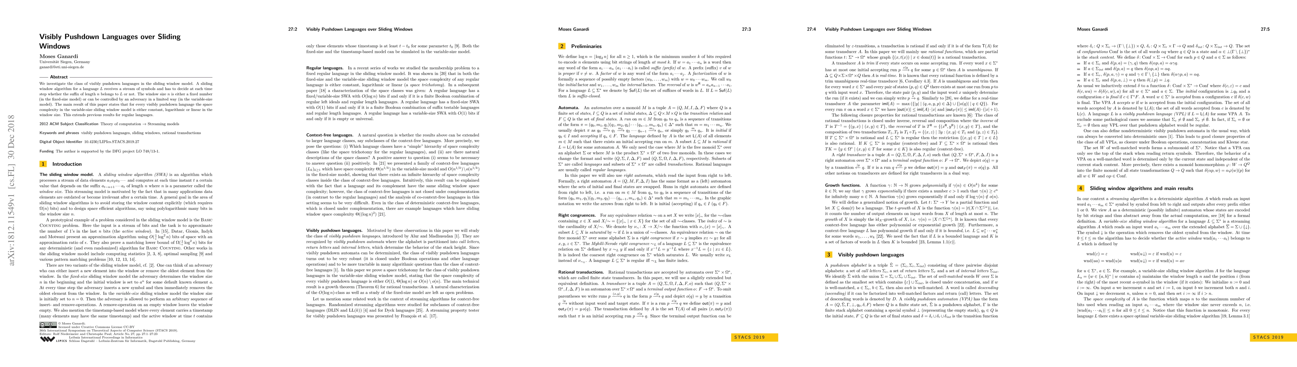 We investigate the class of visibly pushdown languages in the sliding window model. A sliding window algorithm for a language $L$ receives a stream of symbols and has to decide at each time step whether the suffix of length $n$ belongs to $L$ or not. The window size $n$ is either a fixed number (in the fixed-size model) or can be controlled by an adversary in a limited way (in the variable-size model). The main result of this paper states that for every visibly pushdown language the space complexity in the variable-size sliding window model is either constant, logarithmic or linear in the window size. This extends previous results for regular languages.