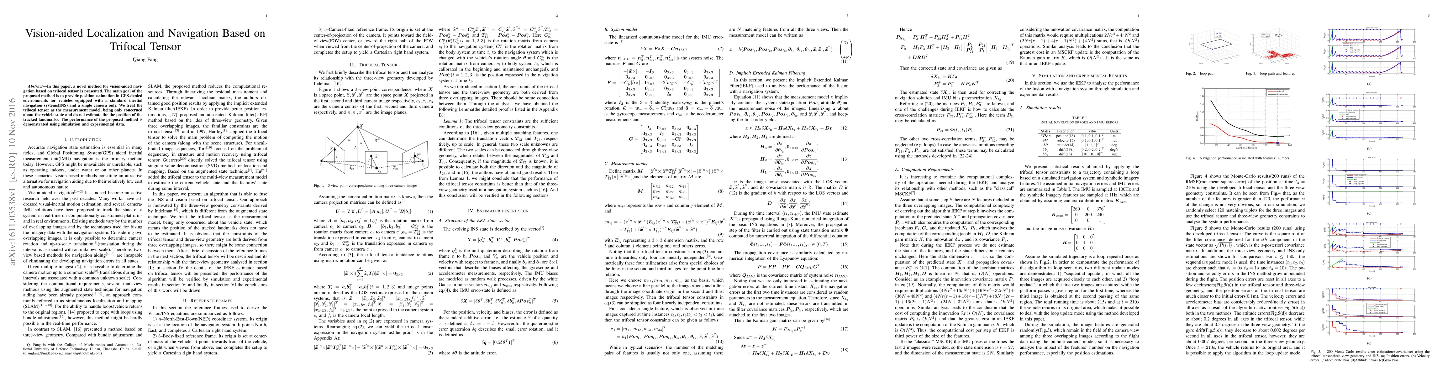 In this paper, a novel method for vision-aided navigation based on trifocal tensor is presented. The main goal of the proposed method is to provide position estimation in GPS-denied environments for vehicles equipped with a standard inertial navigation systems(INS) and a single camera only. We treat the trifocal tensor as the measurement model, being only concerned about the vehicle state and do not estimate the the position of the tracked landmarks. The performance of the proposed method is demonstrated using simulation and experimental data.