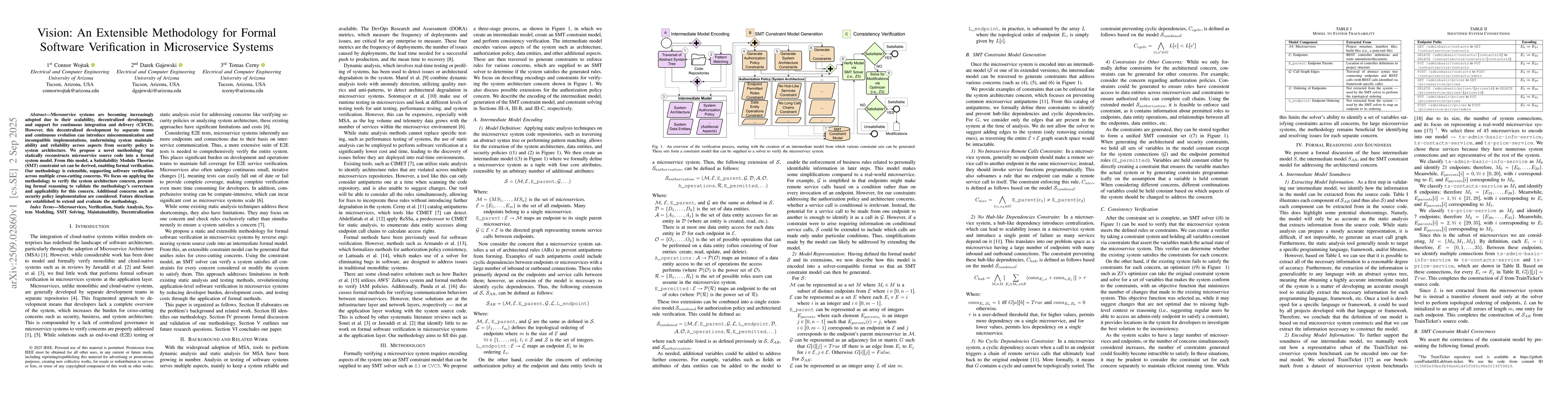 Microservice systems are becoming increasingly adopted due to their scalability, decentralized development, and support for continuous integration and delivery (CI/CD). However, this decentralized development by separate teams and continuous evolution can introduce miscommunication and incompatible implementations, undermining system maintainability and reliability across aspects from security policy to system architecture. We propose a novel methodology that statically reconstructs microservice source code into a formal system model. From this model, a Satisfiability Modulo Theories (SMT) constraint set can be derived, enabling formal verification. Our methodology is extensible, supporting software verification across multiple cross-cutting concerns. We focus on applying the methodology to verify the system architecture concern, presenting formal reasoning to validate the methodology's correctness and applicability for this concern. Additional concerns such as security policy implementation are considered. Future directions are established to extend and evaluate the methodology.