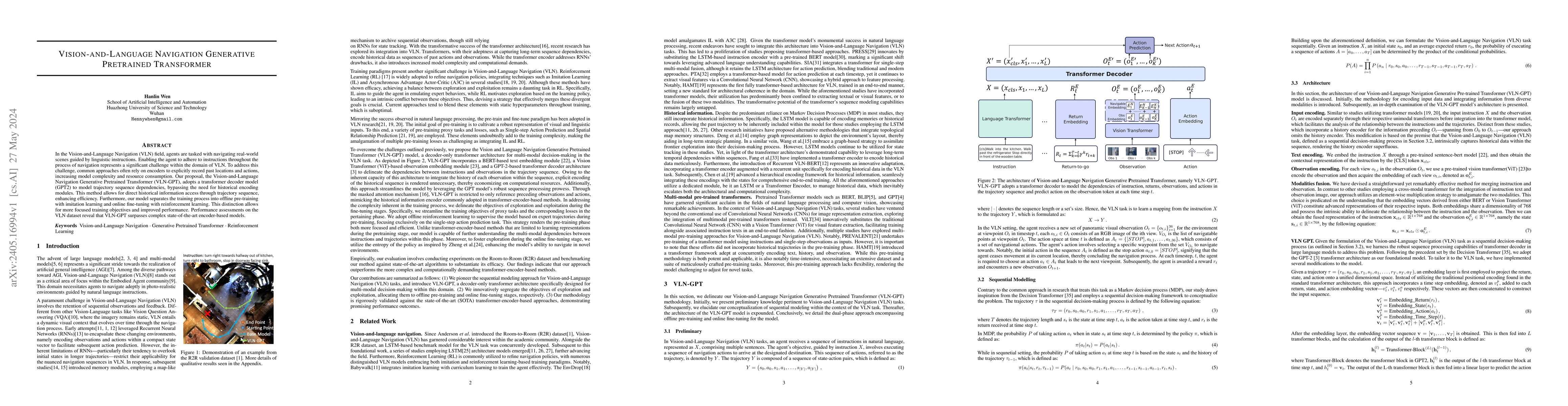 The Vision-and-Language Navigation Generative Pretrained Transformer (VLN-GPT) utilizes a transformer decoder model to efficiently model trajectory sequence dependencies, avoiding the complexity of traditional encoders. It achieves superior performance over state-of-the-art encoder-based models through a training regimen that includes offline pre-training and online fine-tuning.
