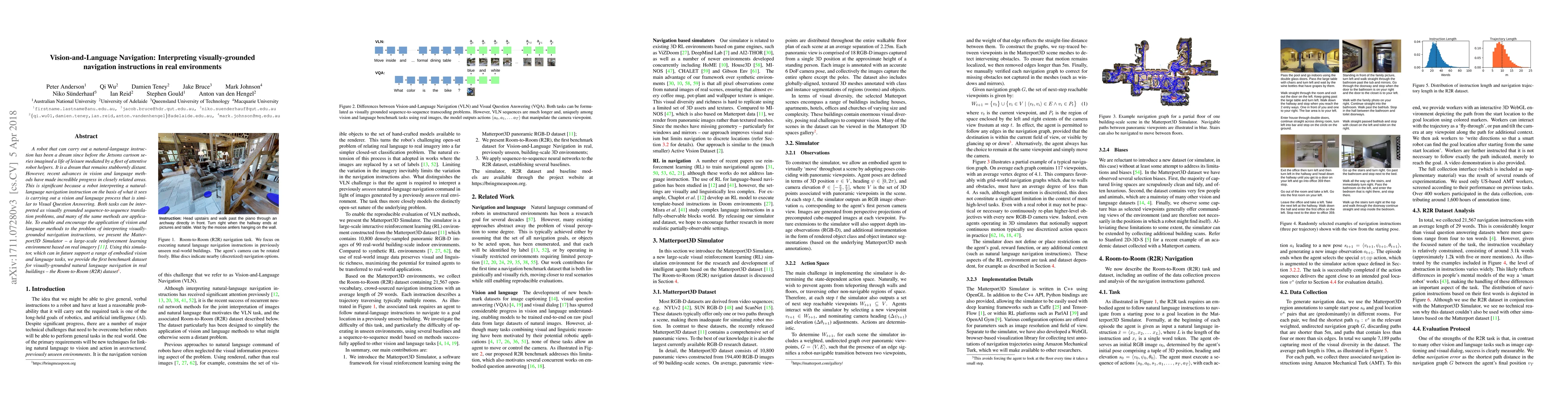 This paper introduces the Matterport3D Simulator and the Room-to-Room (R2R) dataset to advance vision-and-language navigation, enabling robots to interpret natural-language navigation instructions based on visual context. The R2R dataset serves as a benchmark for evaluating progress in this field.