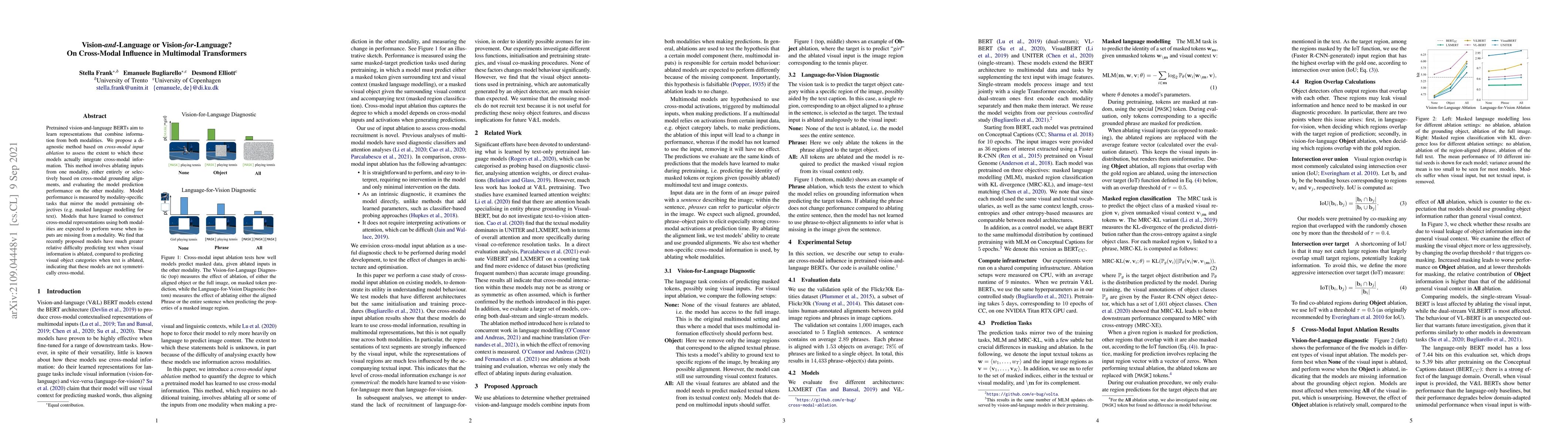 Pretrained vision-and-language BERTs aim to learn representations that combine information from both modalities. We propose a diagnostic method based on cross-modal input ablation to assess the extent to which these models actually integrate cross-modal information. This method involves ablating inputs from one modality, either entirely or selectively based on cross-modal grounding alignments, and evaluating the model prediction performance on the other modality. Model performance is measured by modality-specific tasks that mirror the model pretraining objectives (e.g. masked language modelling for text). Models that have learned to construct cross-modal representations using both modalities are expected to perform worse when inputs are missing from a modality. We find that recently proposed models have much greater relative difficulty predicting text when visual information is ablated, compared to predicting visual object categories when text is ablated, indicating that these models are not symmetrically cross-modal.