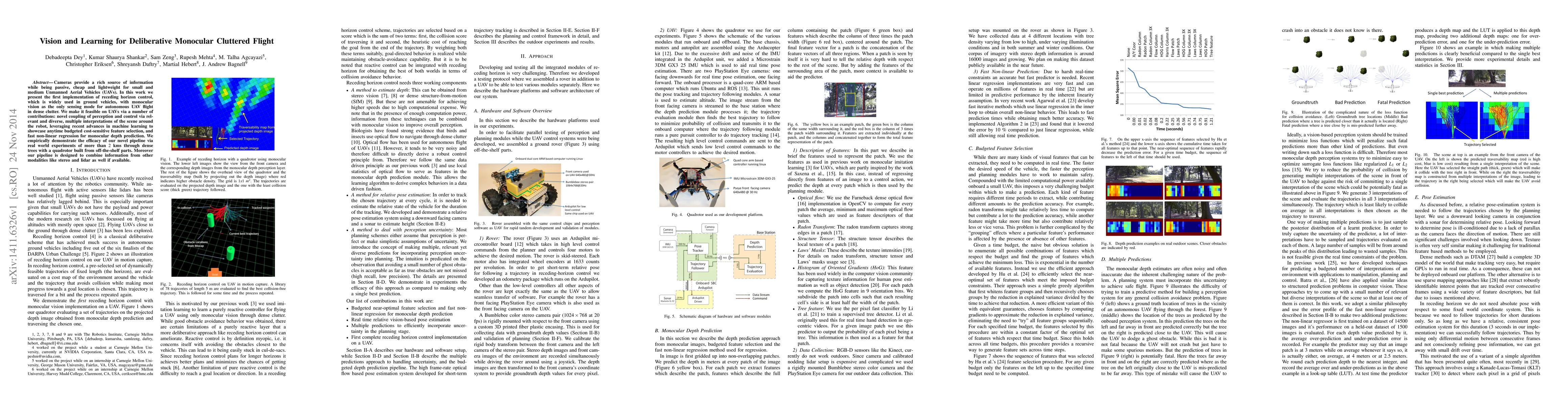 Cameras provide a rich source of information while being passive, cheap and lightweight for small and medium Unmanned Aerial Vehicles (UAVs). In this work we present the first implementation of receding horizon control, which is widely used in ground vehicles, with monocular vision as the only sensing mode for autonomous UAV flight in dense clutter. We make it feasible on UAVs via a number of contributions: novel coupling of perception and control via relevant and diverse, multiple interpretations of the scene around the robot, leveraging recent advances in machine learning to showcase anytime budgeted cost-sensitive feature selection, and fast non-linear regression for monocular depth prediction. We empirically demonstrate the efficacy of our novel pipeline via real world experiments of more than 2 kms through dense trees with a quadrotor built from off-the-shelf parts. Moreover our pipeline is designed to combine information from other modalities like stereo and lidar as well if available.