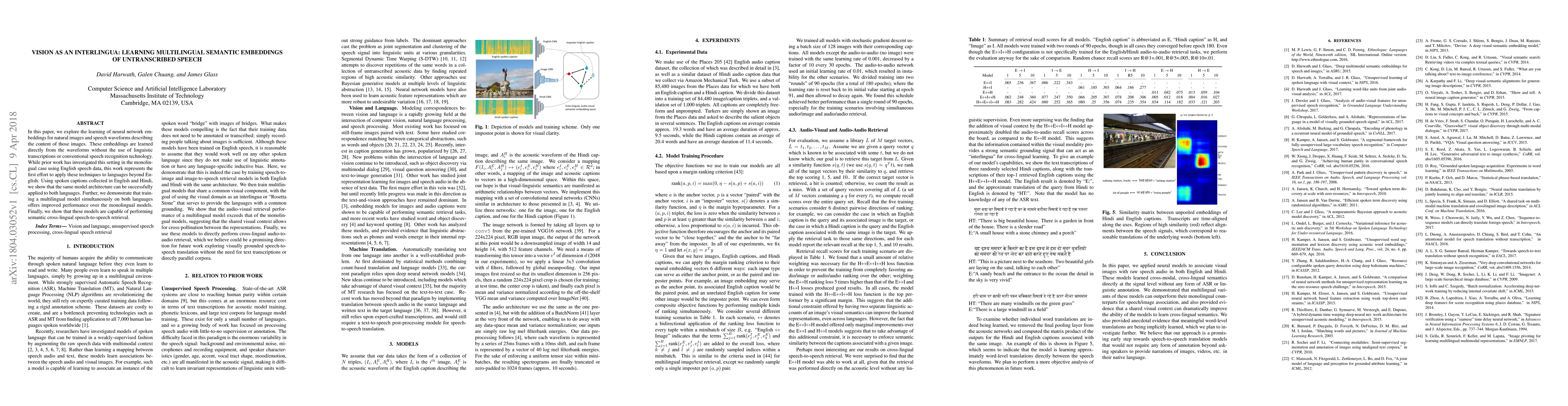 This paper investigates neural network embeddings for natural images and speech that learn from untranscribed waveforms, demonstrating successful application to both English and Hindi. The multilingual model shows improved performance over monolingual models and enables cross-lingual speech-to-speech retrieval.