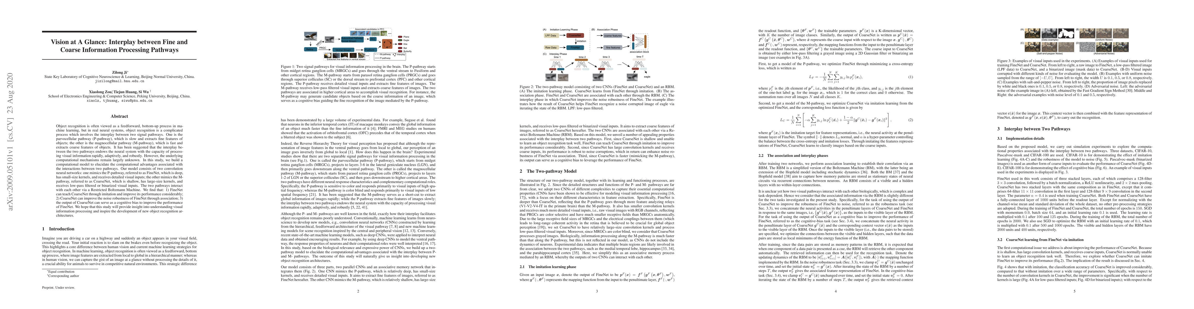 Object recognition is often viewed as a feedforward, bottom-up process in machine learning, but in real neural systems, object recognition is a complicated process which involves the interplay between two signal pathways. One is the parvocellular pathway (P-pathway), which is slow and extracts fine features of objects; the other is the magnocellular pathway (M-pathway), which is fast and extracts coarse features of objects. It has been suggested that the interplay between the two pathways endows the neural system with the capacity of processing visual information rapidly, adaptively, and robustly. However, the underlying computational mechanisms remain largely unknown. In this study, we build a computational model to elucidate the computational advantages associated with the interactions between two pathways. Our model consists of two convolution neural networks: one mimics the P-pathway, referred to as FineNet, which is deep, has small-size kernels, and receives detailed visual inputs; the other mimics the M-pathway, referred to as CoarseNet, which is shallow, has large-size kernels, and receives low-pass filtered or binarized visual inputs. The two pathways interact with each other via a Restricted Boltzmann Machine. We find that: 1) FineNet can teach CoarseNet through imitation and improve its performance considerably; 2) CoarseNet can improve the noise robustness of FineNet through association; 3) the output of CoarseNet can serve as a cognitive bias to improve the performance of FineNet. We hope that this study will provide insight into understanding visual information processing and inspire the development of new object recognition architectures.