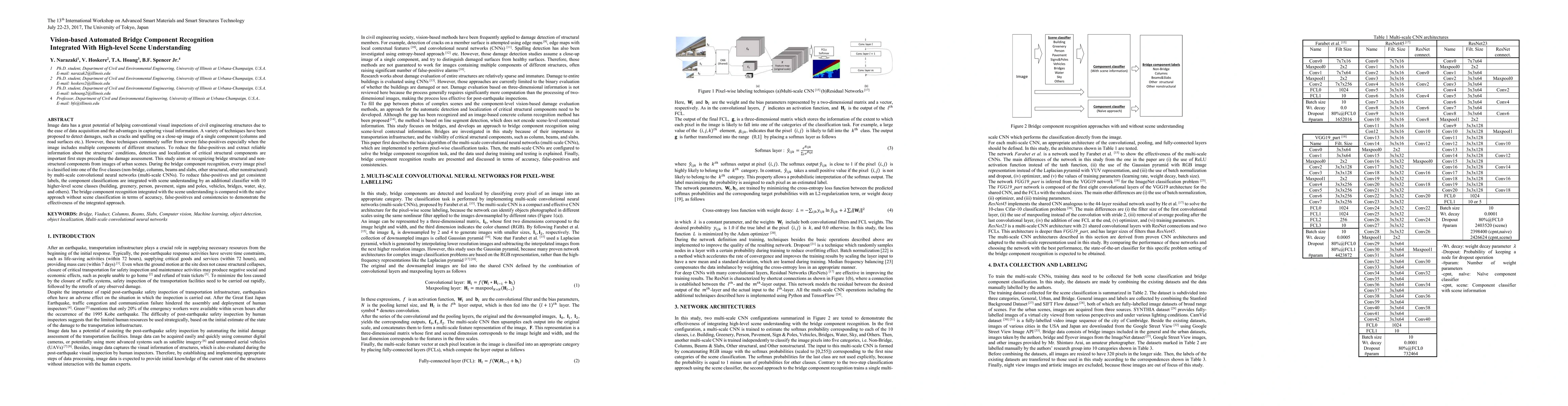 This paper proposes a vision-based automated method for recognizing bridge components using multi-scale CNNs, aiming to reduce false-positives by integrating high-level scene understanding through additional classification of broader scene elements. The integrated approach is shown to improve accuracy and consistency compared to a naive method without scene classification.