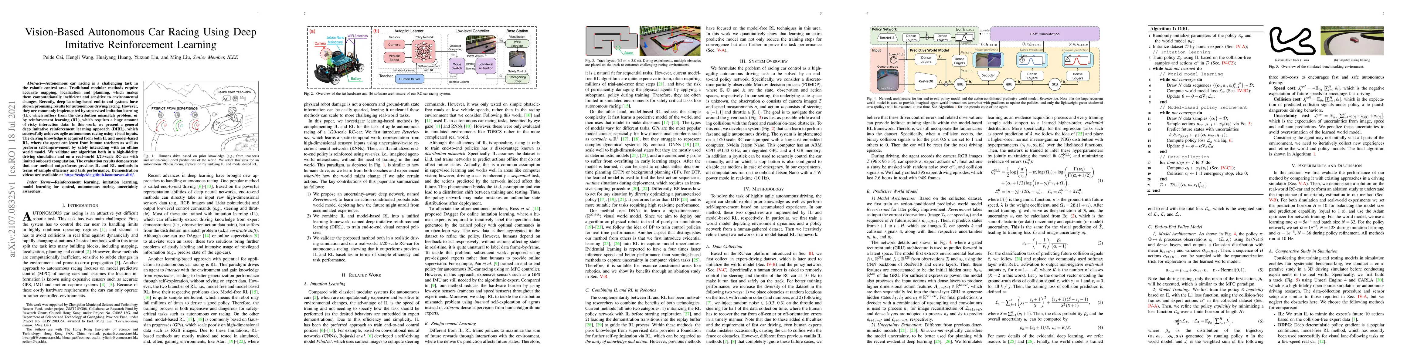 This paper introduces a deep imitative reinforcement learning approach (DIRL) for vision-based autonomous car racing, combining supervised imitation learning and model-based reinforcement learning to achieve efficient and agile racing. The method demonstrates superior performance and sample efficiency compared to traditional methods in both simulation and real-world tests.