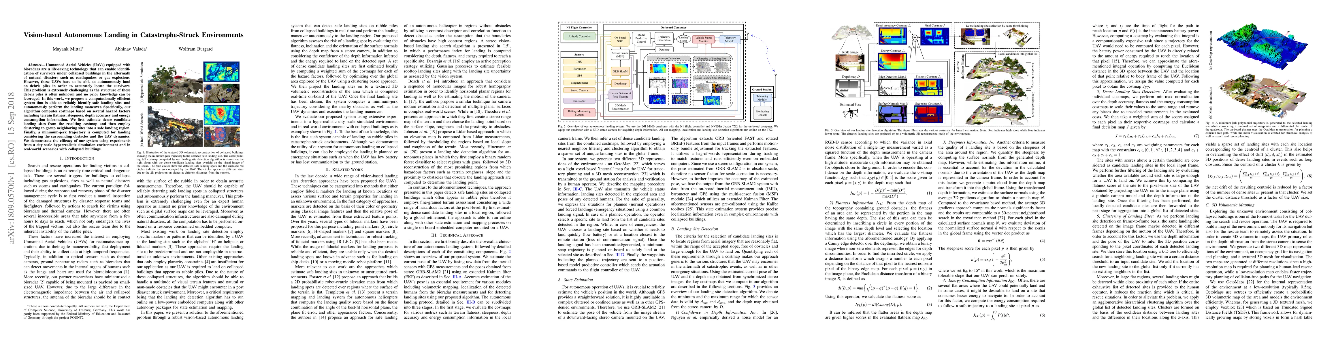 Unmanned Aerial Vehicles (UAVs) equipped with bioradars are a life-saving technology that can enable identification of survivors under collapsed buildings in the aftermath of natural disasters such as earthquakes or gas explosions. However, these UAVs have to be able to autonomously land on debris piles in order to accurately locate the survivors. This problem is extremely challenging as the structure of these debris piles is often unknown and no prior knowledge can be leveraged. In this work, we propose a computationally efficient system that is able to reliably identify safe landing sites and autonomously perform the landing maneuver. Specifically, our algorithm computes costmaps based on several hazard factors including terrain flatness, steepness, depth accuracy and energy consumption information. We first estimate dense candidate landing sites from the resulting costmap and then employ clustering to group neighboring sites into a safe landing region. Finally, a minimum-jerk trajectory is computed for landing considering the surrounding obstacles and the UAV dynamics. We demonstrate the efficacy of our system using experiments from a city scale hyperrealistic simulation environment and in real-world scenarios with collapsed buildings.
