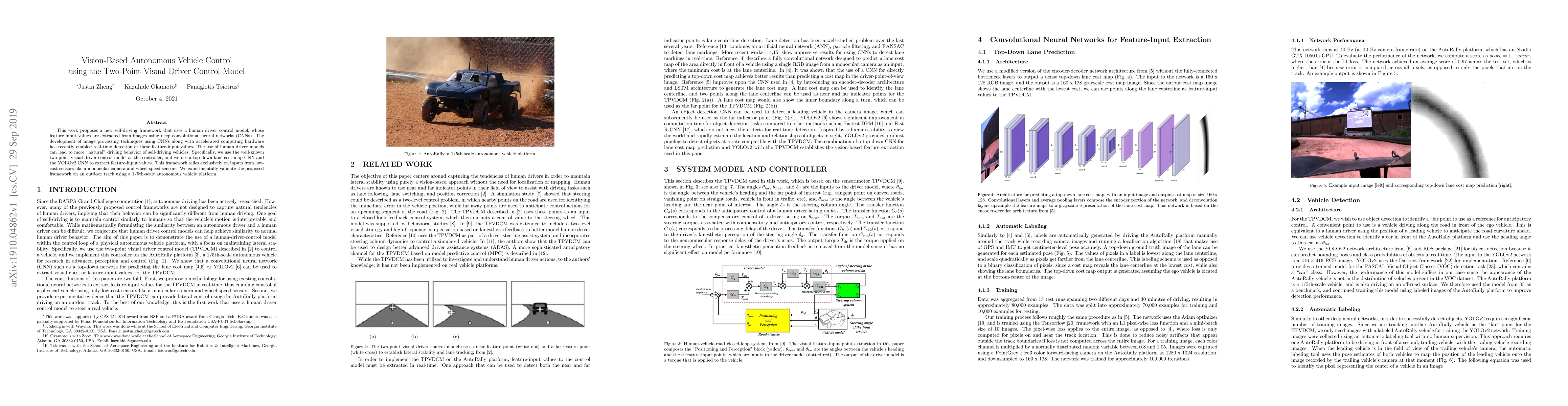 This paper introduces a self-driving framework that mimics human driver control using deep CNNs for image processing, specifically employing the two-point visual driver control model. The framework leverages a monocular camera and wheel speed sensors for real-time feature extraction and control, validated through experiments on a scaled autonomous vehicle.