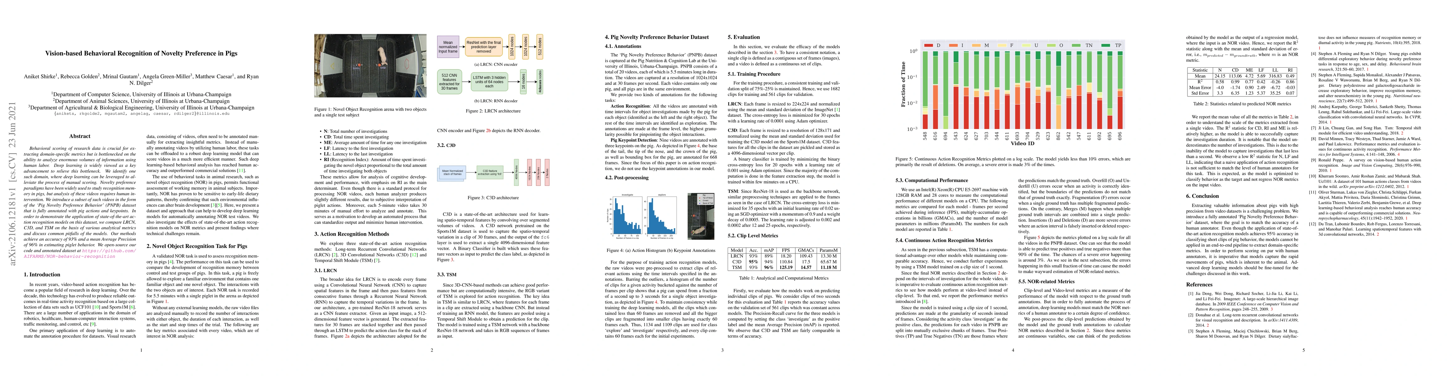 Behavioral scoring of research data is crucial for extracting domain-specific metrics but is bottlenecked on the ability to analyze enormous volumes of information using human labor. Deep learning is widely viewed as a key advancement to relieve this bottleneck. We identify one such domain, where deep learning can be leveraged to alleviate the process of manual scoring. Novelty preference paradigms have been widely used to study recognition memory in pigs, but analysis of these videos requires human intervention. We introduce a subset of such videos in the form of the 'Pig Novelty Preference Behavior' (PNPB) dataset that is fully annotated with pig actions and keypoints. In order to demonstrate the application of state-of-the-art action recognition models on this dataset, we compare LRCN, C3D, and TSM on the basis of various analytical metrics and discuss common pitfalls of the models. Our methods achieve an accuracy of 93% and a mean Average Precision of 96% in estimating piglet behavior. We open-source our code and annotated dataset at https://github.com/AIFARMS/NOR-behavior-recognition