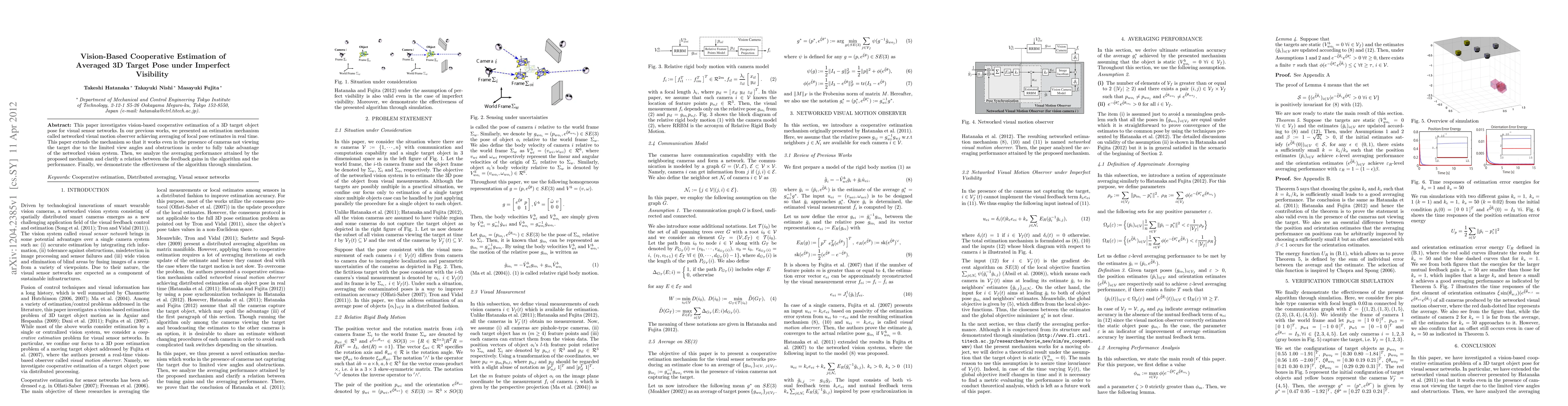 This paper extends a networked visual motion observer mechanism to cooperatively estimate the 3D pose of a target object in visual sensor networks under imperfect visibility. It analyzes the averaging performance and the impact of feedback gains, demonstrating the algorithm's effectiveness through simulations.