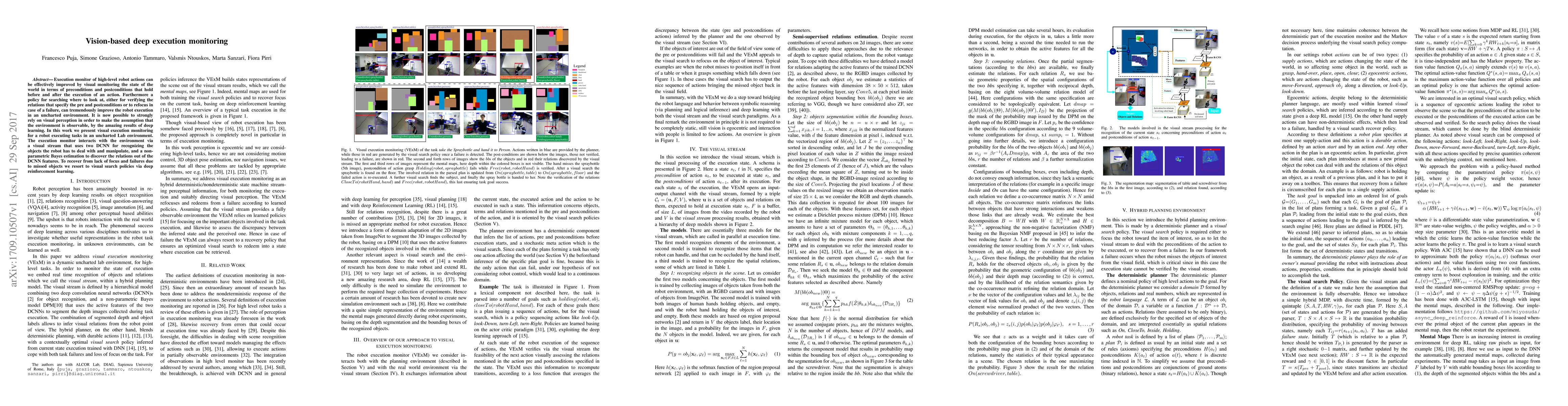 This paper presents a vision-based deep execution monitoring system for robots, using visual perception to verify preconditions and postconditions of actions. It employs deep convolutional neural networks (DCNN) and non-parametric Bayes estimation to recognize objects and discover relations, supplemented by reinforcement learning for visual search and recovery from failures.