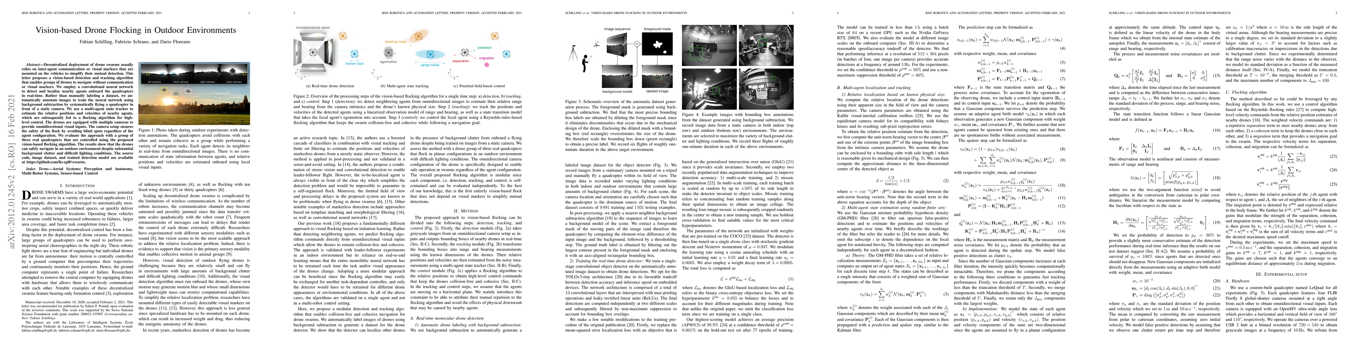 This paper proposes a vision-based algorithm for drone flocking without inter-agent communication or visual markers, using a convolutional neural network for real-time drone detection and localization. The method employs automatic image annotation for training and multi-camera setups for omnidirectional vision, successfully enabling safe navigation in outdoor environments.