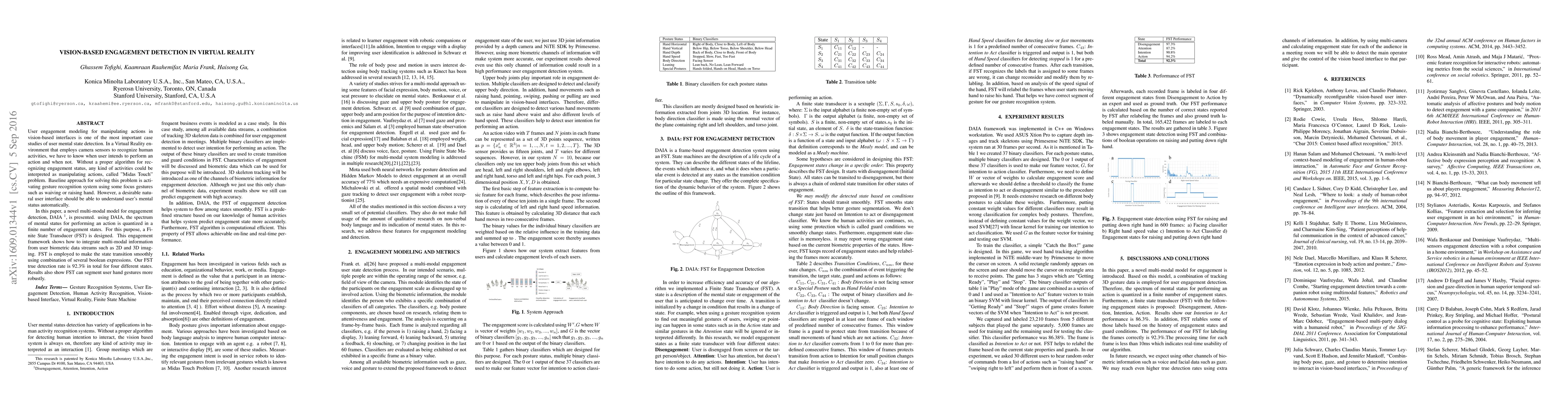 User engagement modeling for manipulating actions in vision-based interfaces is one of the most important case studies of user mental state detection. In a Virtual Reality environment that employs camera sensors to recognize human activities, we have to know when user intends to perform an action and when not. Without a proper algorithm for recognizing engagement status, any kind of activities could be interpreted as manipulating actions, called "Midas Touch" problem. Baseline approach for solving this problem is activating gesture recognition system using some focus gestures such as waiving or raising hand. However, a desirable natural user interface should be able to understand user's mental status automatically. In this paper, a novel multi-modal model for engagement detection, DAIA, is presented. using DAIA, the spectrum of mental status for performing an action is quantized in a finite number of engagement states. For this purpose, a Finite State Transducer (FST) is designed. This engagement framework shows how to integrate multi-modal information from user biometric data streams such as 2D and 3D imaging. FST is employed to make the state transition smoothly using combination of several boolean expressions. Our FST true detection rate is 92.3% in total for four different states. Results also show FST can segment user hand gestures more robustly.