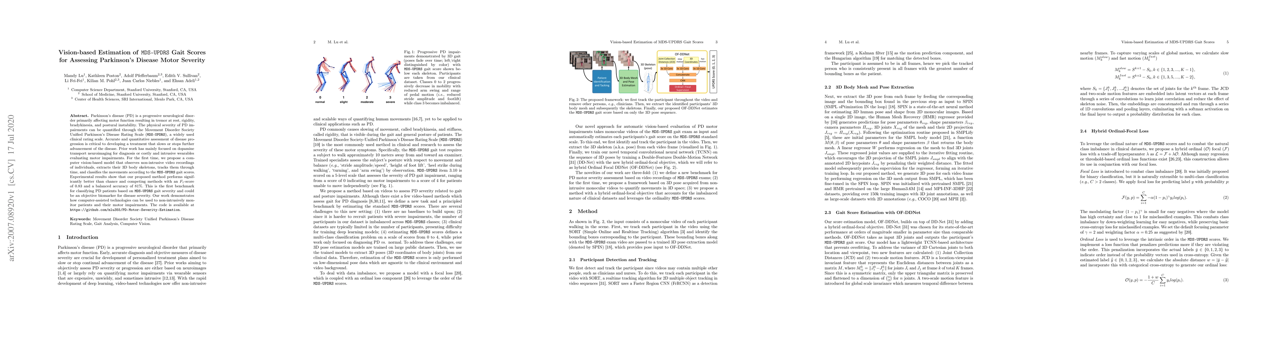 Parkinson's disease (PD) is a progressive neurological disorder primarily affecting motor function resulting in tremor at rest, rigidity, bradykinesia, and postural instability. The physical severity of PD impairments can be quantified through the Movement Disorder Society Unified Parkinson's Disease Rating Scale (MDS-UPDRS), a widely used clinical rating scale. Accurate and quantitative assessment of disease progression is critical to developing a treatment that slows or stops further advancement of the disease. Prior work has mainly focused on dopamine transport neuroimaging for diagnosis or costly and intrusive wearables evaluating motor impairments. For the first time, we propose a computer vision-based model that observes non-intrusive video recordings of individuals, extracts their 3D body skeletons, tracks them through time, and classifies the movements according to the MDS-UPDRS gait scores. Experimental results show that our proposed method performs significantly better than chance and competing methods with an F1-score of 0.83 and a balanced accuracy of 81%. This is the first benchmark for classifying PD patients based on MDS-UPDRS gait severity and could be an objective biomarker for disease severity. Our work demonstrates how computer-assisted technologies can be used to non-intrusively monitor patients and their motor impairments. The code is available at https://github.com/mlu355/PD-Motor-Severity-Estimation.