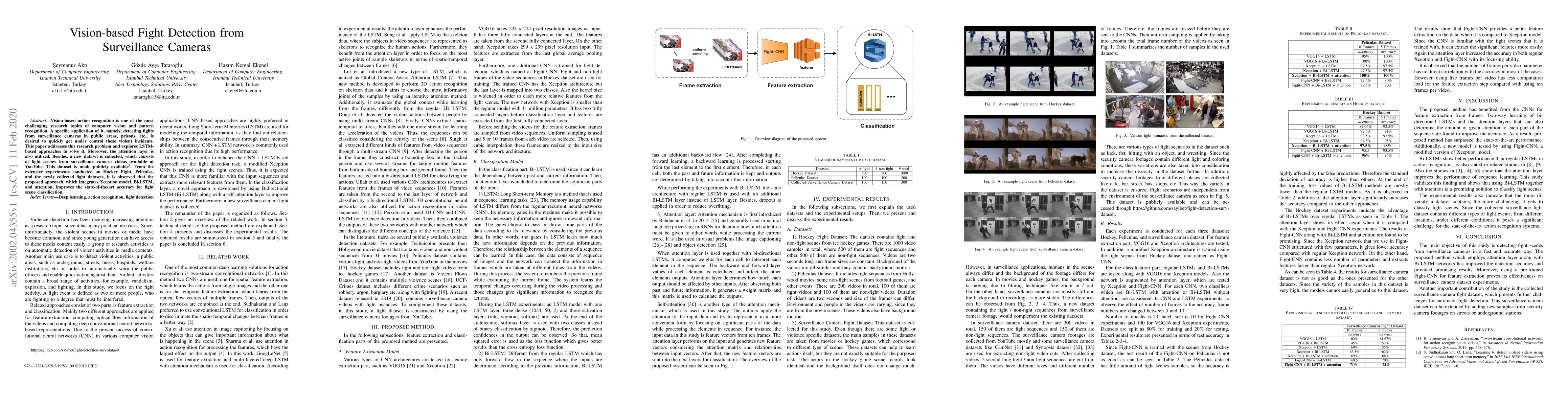 This paper proposes an LSTM-based approach with an attention layer to detect fights from surveillance camera footage, utilizing a newly collected and publicly available dataset. The integrated Xception model, Bi-LSTM, and attention layer achieve state-of-the-art accuracy in fight scene classification.