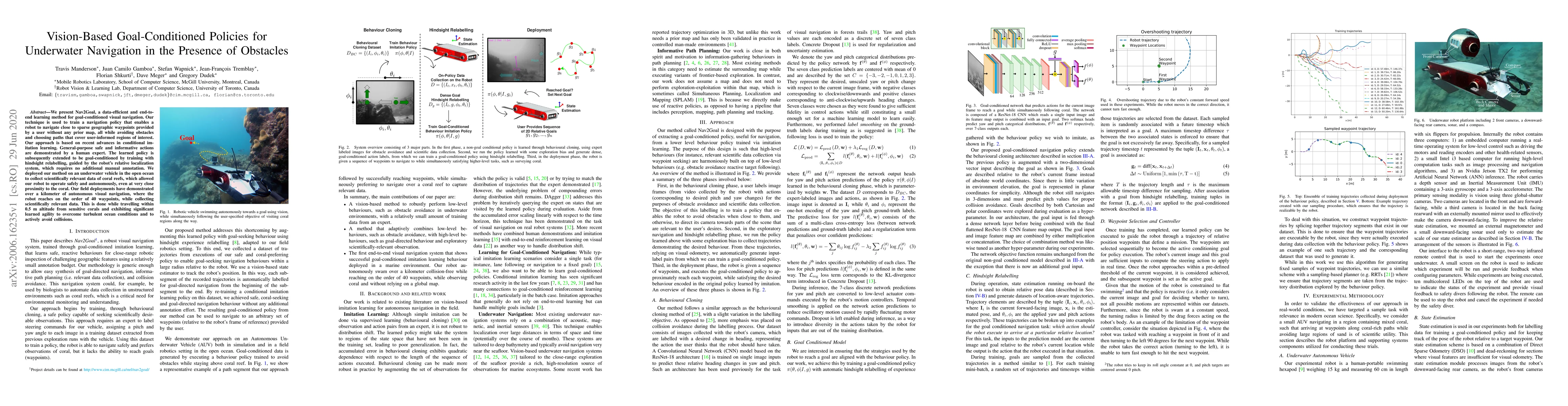 Nav2Goal employs vision-based goal-conditioned policies for underwater navigation, enabling a robot to autonomously reach sparse waypoints while avoiding obstacles, demonstrated by human expert actions. Field tests on an underwater vehicle successfully covered over a kilometer, reaching 40 waypoints while maintaining safe proximity to coral reefs.