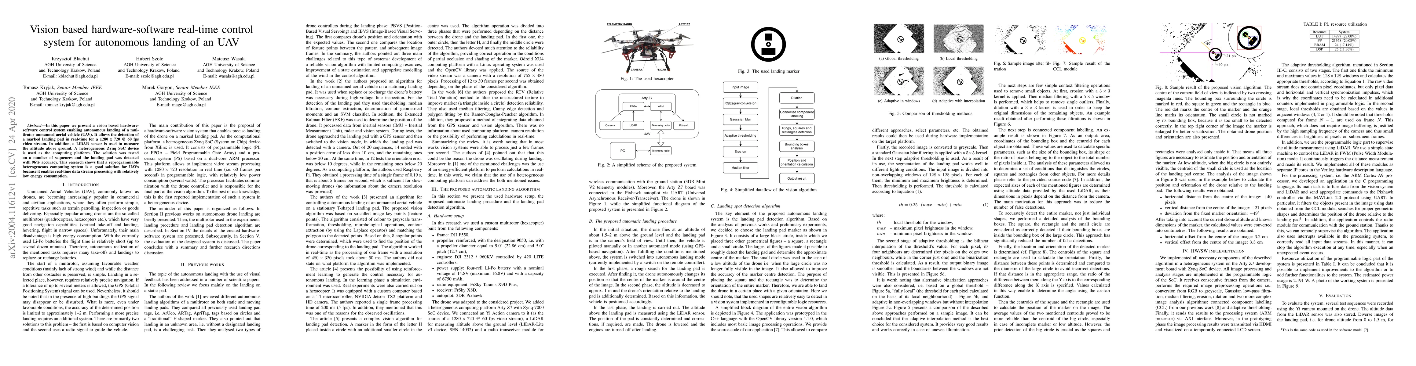 In this paper we present a vision based hardware-software control system enabling autonomous landing of a multirotor unmanned aerial vehicle (UAV). It allows the detection of a marked landing pad in real-time for a 1280 x 720 @ 60 fps video stream. In addition, a LiDAR sensor is used to measure the altitude above ground. A heterogeneous Zynq SoC device is used as the computing platform. The solution was tested on a number of sequences and the landing pad was detected with 96% accuracy. This research shows that a reprogrammable heterogeneous computing system is a good solution for UAVs because it enables real-time data stream processing with relatively low energy consumption.