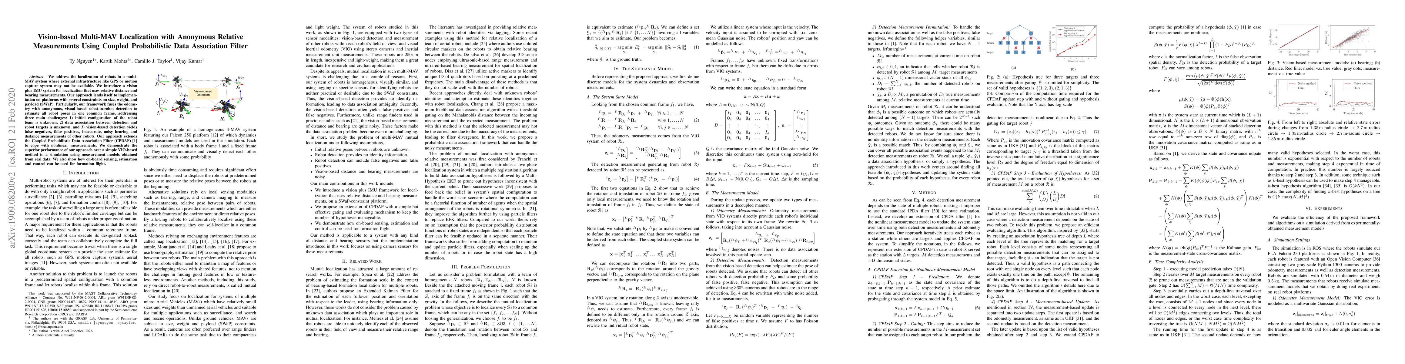 We address the localization of robots in a multi-MAV system where external infrastructure like GPS or motion capture systems may not be available. Our approach lends itself to implementation on platforms with several constraints on size, weight, and power (SWaP). Particularly, our framework fuses the onboard VIO with the anonymous, visual-based robot-to-robot detection to estimate all robot poses in one common frame, addressing three main challenges: 1) the initial configuration of the robot team is unknown, 2) the data association between each vision-based detection and robot targets is unknown, and 3) the vision-based detection yields false negatives, false positives, inaccurate, and provides noisy bearing, distance measurements of other robots. Our approach extends the Coupled Probabilistic Data Association Filter (CPDAF)[1] to cope with nonlinear measurements. We demonstrate the superior performance of our approach over a simple VIO-based method in a simulation with the measurement models statistically modeled using the real experimental data. We also show how onboard sensing, estimation, and control can be used for formation flight.