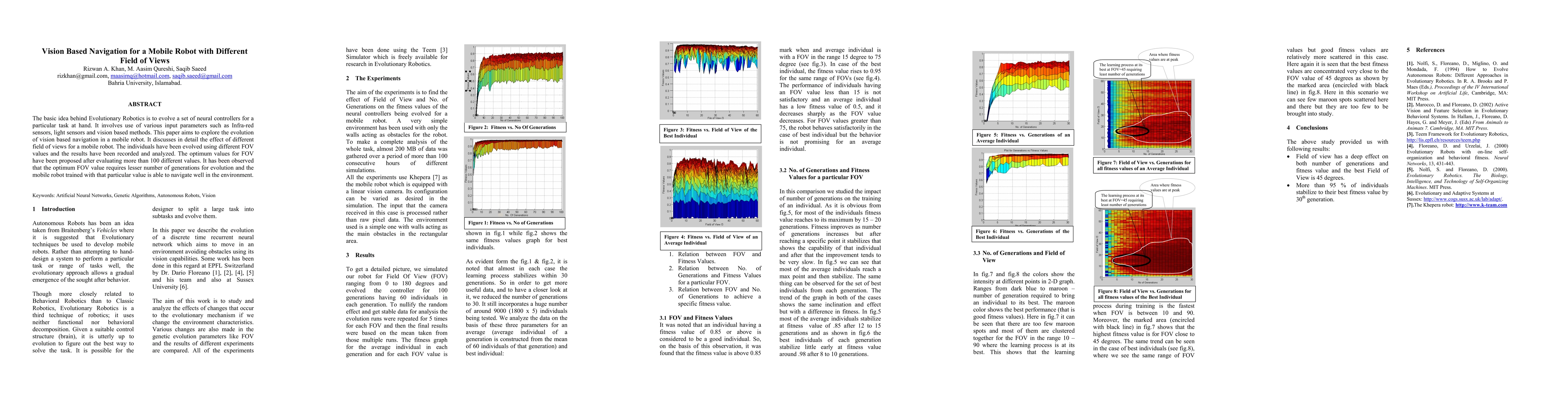 The basic idea behind evolutionary robotics is to evolve a set of neural controllers for a particular task at hand. It involves use of various input parameters such as infrared sensors, light sensors and vision based methods. This paper aims to explore the evolution of vision based navigation in a mobile robot. It discusses in detail the effect of different field of views for a mobile robot. The individuals have been evolved using different FOV values and the results have been recorded and analyzed.The optimum values for FOV have been proposed after evaluating more than 100 different values. It has been observed that the optimum FOV value requires lesser number of generations for evolution and the mobile robot trained with that particular value is able to navigate well in the environment.
