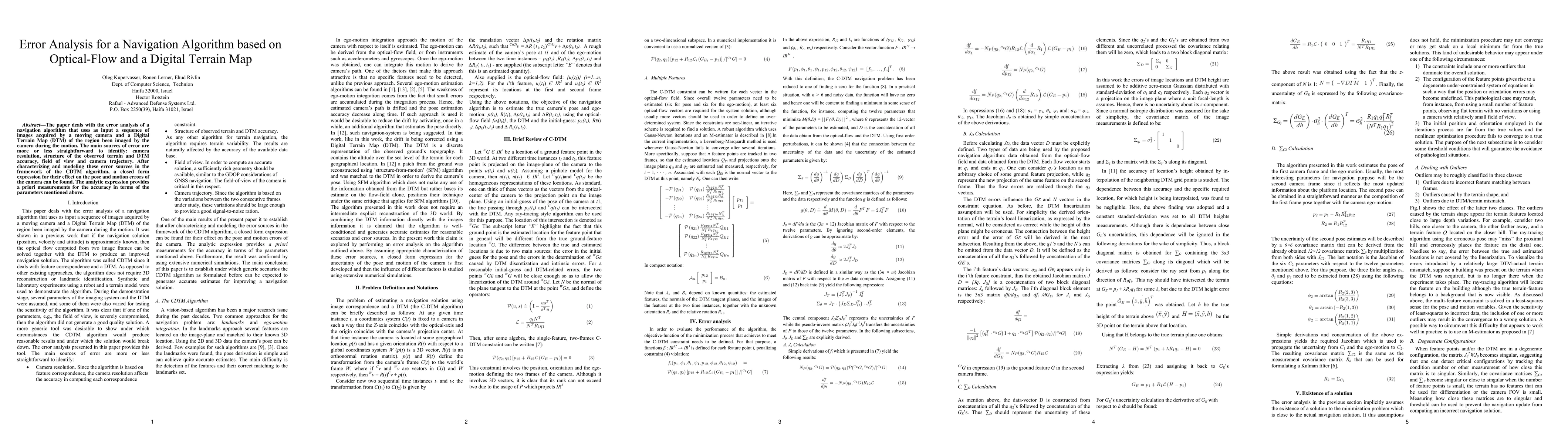 The paper deals with the error analysis of a navigation algorithm that uses as input a sequence of images acquired by a moving camera and a Digital Terrain Map (DTM) of the region been imaged by the camera during the motion. The main sources of error are more or less straightforward to identify: camera resolution, structure of the observed terrain and DTM accuracy, field of view and camera trajectory. After characterizing and modeling these error sources in the framework of the CDTM algorithm, a closed form expression for their effect on the pose and motion errors of the camera can be found. The analytic expression provides a priori measurements for the accuracy in terms of the parameters mentioned above.