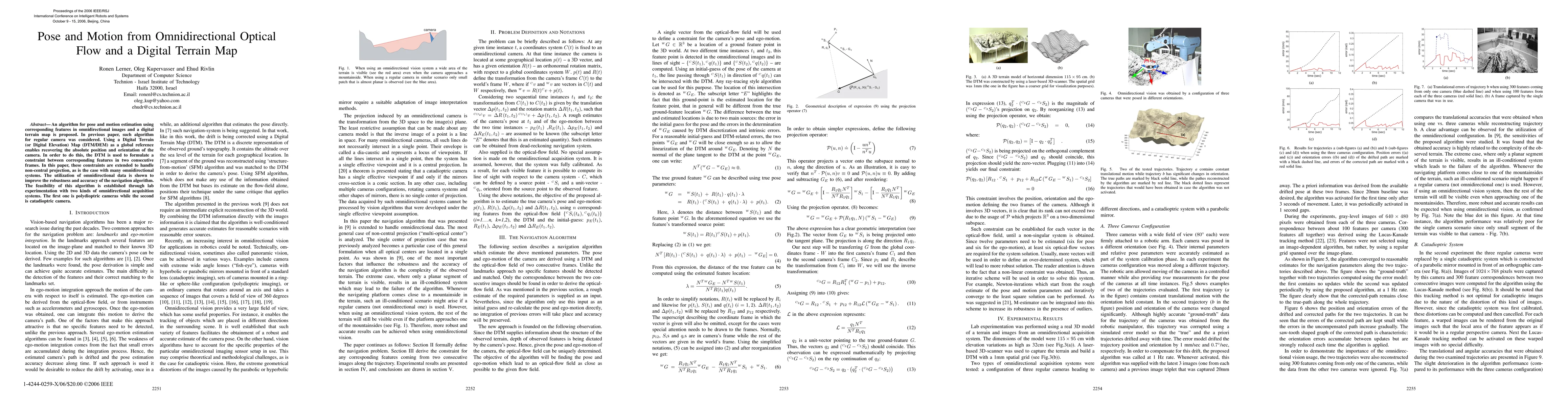 An algorithm for pose and motion estimation using corresponding features in omnidirectional images and a digital terrain map is proposed. In previous paper, such algorithm for regular camera was considered. Using a Digital Terrain (or Digital Elevation) Map (DTM/DEM) as a global reference enables recovering the absolute position and orientation of the camera. In order to do this, the DTM is used to formulate a constraint between corresponding features in two consecutive frames. In this paper, these constraints are extended to handle non-central projection, as is the case with many omnidirectional systems. The utilization of omnidirectional data is shown to improve the robustness and accuracy of the navigation algorithm. The feasibility of this algorithm is established through lab experimentation with two kinds of omnidirectional acquisition systems. The first one is polydioptric cameras while the second is catadioptric camera.