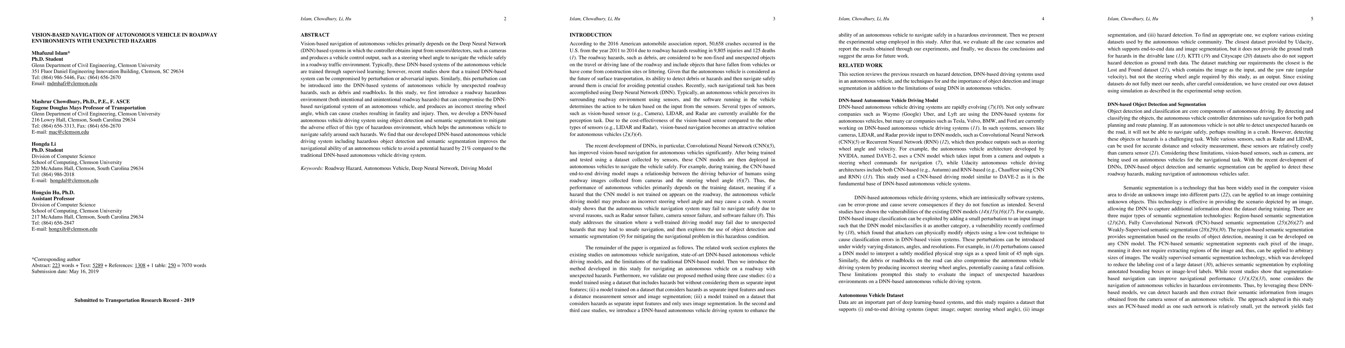 This paper investigates vision-based navigation of autonomous vehicles in hazardous roadway environments, introducing methods to detect and avoid unexpected hazards using DNN-based systems with object detection and semantic segmentation, which improves navigational safety by 21% compared to traditional systems.