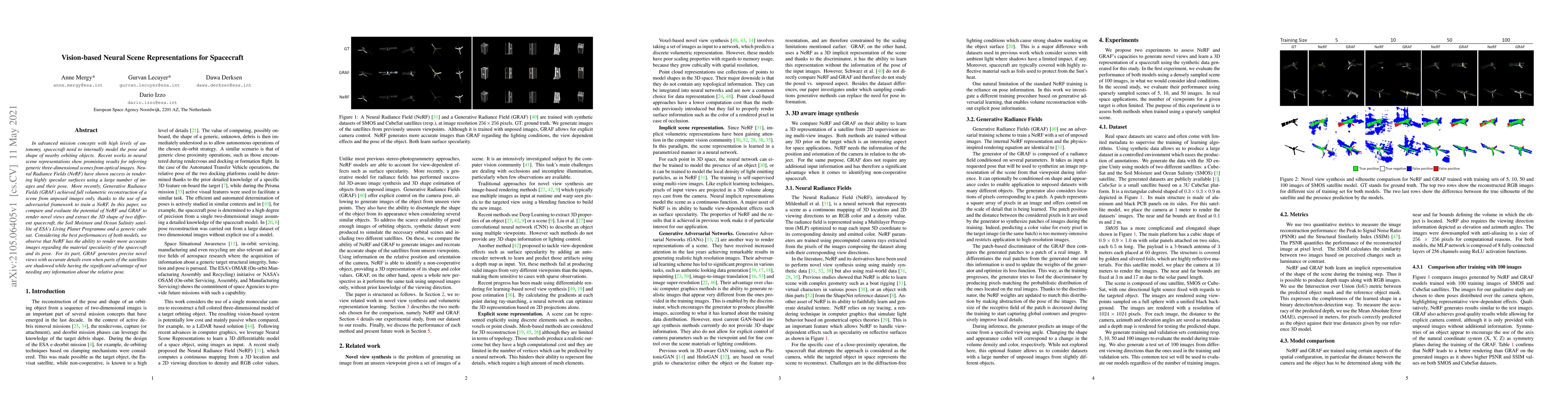 In advanced mission concepts with high levels of autonomy, spacecraft need to internally model the pose and shape of nearby orbiting objects. Recent works in neural scene representations show promising results for inferring generic three-dimensional scenes from optical images. Neural Radiance Fields (NeRF) have shown success in rendering highly specular surfaces using a large number of images and their pose. More recently, Generative Radiance Fields (GRAF) achieved full volumetric reconstruction of a scene from unposed images only, thanks to the use of an adversarial framework to train a NeRF. In this paper, we compare and evaluate the potential of NeRF and GRAF to render novel views and extract the 3D shape of two different spacecraft, the Soil Moisture and Ocean Salinity satellite of ESA's Living Planet Programme and a generic cube sat. Considering the best performances of both models, we observe that NeRF has the ability to render more accurate images regarding the material specularity of the spacecraft and its pose. For its part, GRAF generates precise novel views with accurate details even when parts of the satellites are shadowed while having the significant advantage of not needing any information about the relative pose.