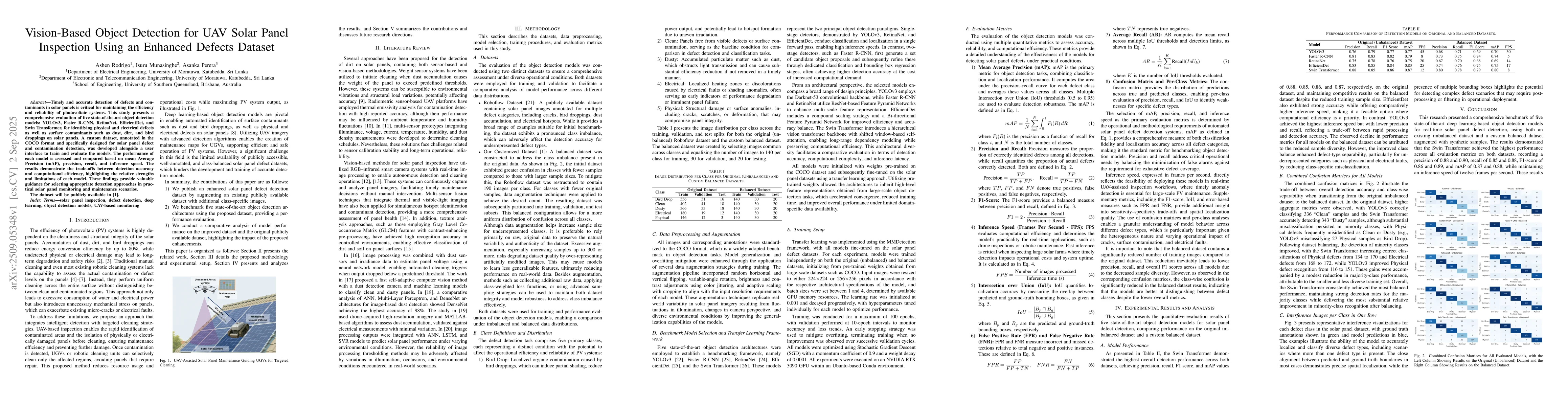 Timely and accurate detection of defects and contaminants in solar panels is critical for maintaining the efficiency and reliability of photovoltaic systems. This study presents a comprehensive evaluation of five state-of-the-art object detection models: YOLOv3, Faster R-CNN, RetinaNet, EfficientDet, and Swin Transformer, for identifying physical and electrical defects as well as surface contaminants such as dust, dirt, and bird droppings on solar panels. A custom dataset, annotated in the COCO format and specifically designed for solar panel defect and contamination detection, was developed alongside a user interface to train and evaluate the models. The performance of each model is assessed and compared based on mean Average Precision (mAP), precision, recall, and inference speed. The results demonstrate the trade-offs between detection accuracy and computational efficiency, highlighting the relative strengths and limitations of each model. These findings provide valuable guidance for selecting appropriate detection approaches in practical solar panel monitoring and maintenance scenarios. The dataset will be publicly available at https://github.com/IsuruMunasinghe98/solar-panel-inspection-dataset.