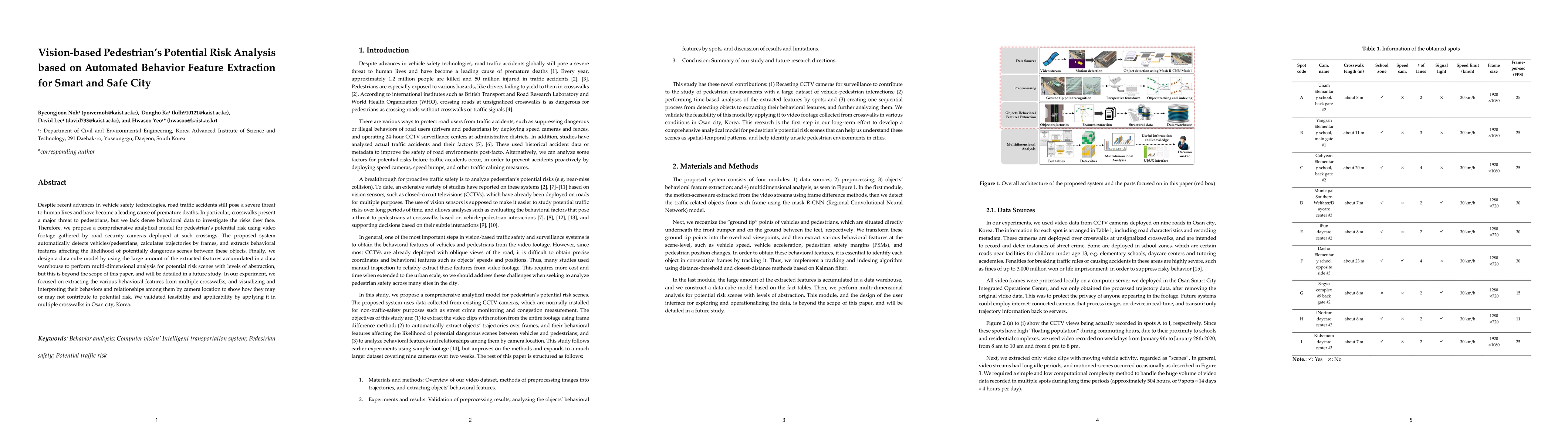 Despite recent advances in vehicle safety technologies, road traffic accidents still pose a severe threat to human lives and have become a leading cause of premature deaths. In particular, crosswalks present a major threat to pedestrians, but we lack dense behavioral data to investigate the risks they face. Therefore, we propose a comprehensive analytical model for pedestrian potential risk using video footage gathered by road security cameras deployed at such crossings. The proposed system automatically detects vehicles and pedestrians, calculates trajectories by frames, and extracts behavioral features affecting the likelihood of potentially dangerous scenes between these objects. Finally, we design a data cube model by using the large amount of the extracted features accumulated in a data warehouse to perform multidimensional analysis for potential risk scenes with levels of abstraction, but this is beyond the scope of this paper, and will be detailed in a future study. In our experiment, we focused on extracting the various behavioral features from multiple crosswalks, and visualizing and interpreting their behaviors and relationships among them by camera location to show how they may or may not contribute to potential risk. We validated feasibility and applicability by applying it in multiple crosswalks in Osan city, Korea.
