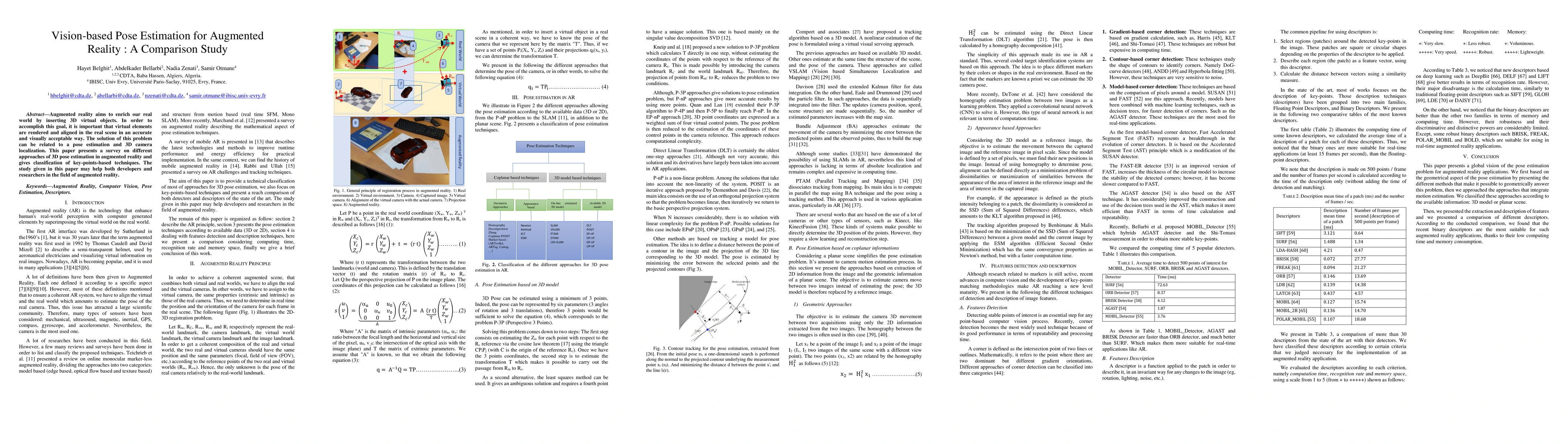 Augmented reality aims to enrich our real world by inserting 3D virtual objects. In order to accomplish this goal, it is important that virtual elements are rendered and aligned in the real scene in an accurate and visually acceptable way. The solution of this problem can be related to a pose estimation and 3D camera localization. This paper presents a survey on different approaches of 3D pose estimation in augmented reality and gives classification of key-points-based techniques. The study given in this paper may help both developers and researchers in the field of augmented reality.