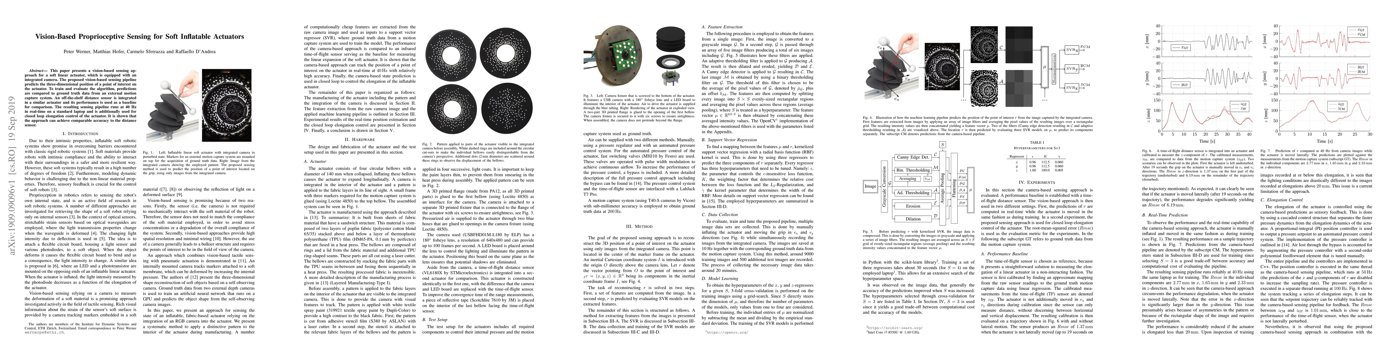 This paper presents a vision-based sensing approach for a soft linear actuator, which is equipped with an integrated camera. The proposed vision-based sensing pipeline predicts the three-dimensional position of a point of interest on the actuator. To train and evaluate the algorithm, predictions are compared to ground truth data from an external motion capture system. An off-the-shelf distance sensor is integrated in a similar actuator and its performance is used as a baseline for comparison. The resulting sensing pipeline runs at 40 Hz in real-time on a standard laptop and is additionally used for closed loop elongation control of the actuator. It is shown that the approach can achieve comparable accuracy to the distance sensor.