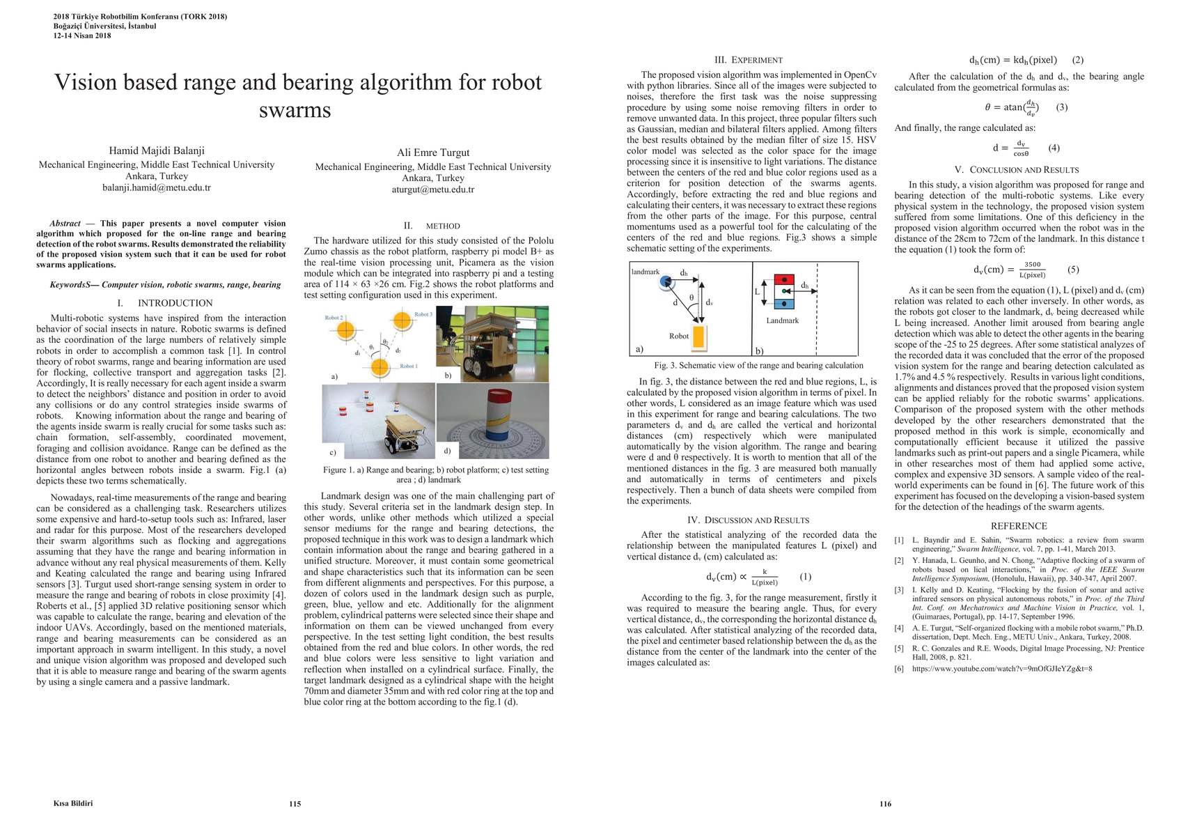 A novel computer vision algorithm was proposed for range and bearing detection of robot swarms using a single camera and passive landmark.