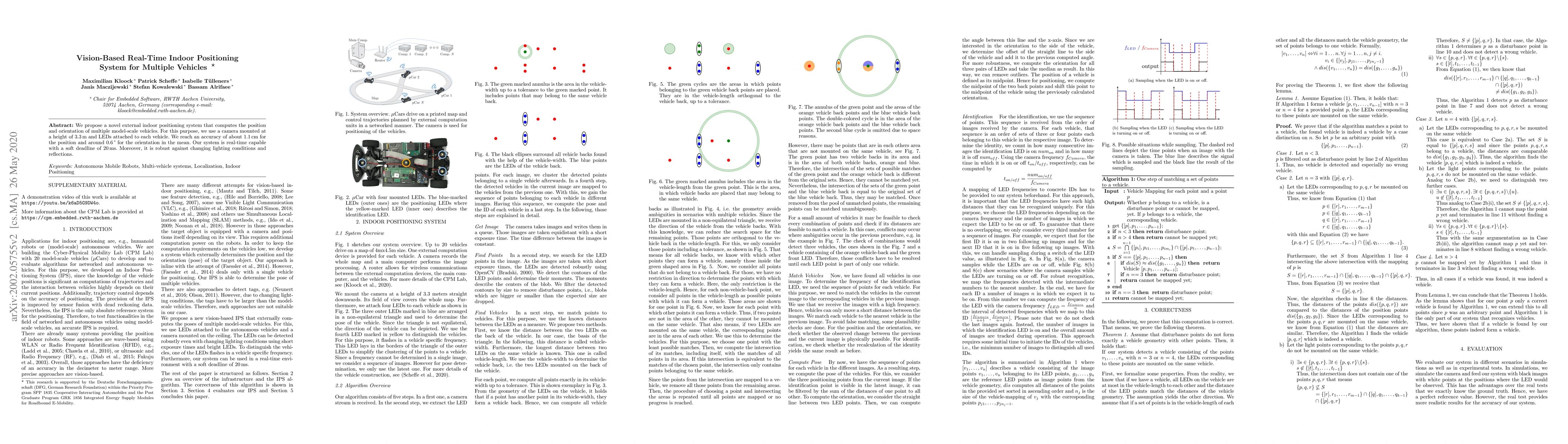 We propose a novel external indoor positioning system that computes the position and orientation of multiple model-scale vehicles. For this purpose, we use a camera mounted at a height of 3.3m and LEDs attached to each vehicle. We reach an accuracy of about 1.1 cm for the position and around 0.6 {\deg} for the orientation in the mean. Our system is real-time capable with a soft deadline of 20 ms. Moreover, it is robust against changing lighting conditions and reflections.