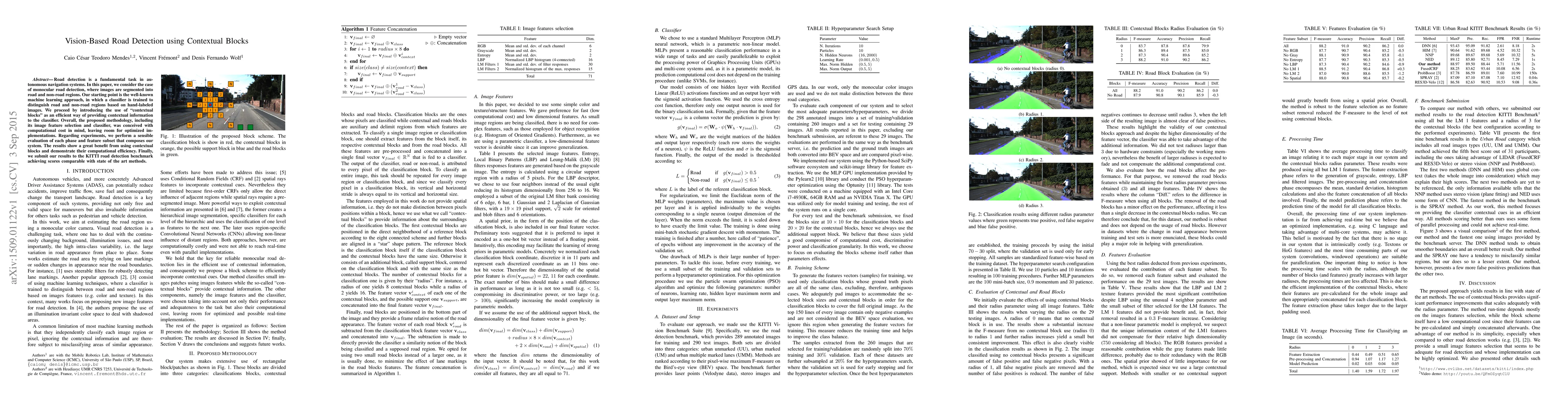 This paper proposes a vision-based road detection method using contextual blocks to enhance the classifier's performance in monocular images. The contextual blocks provide efficient contextual information, leading to competitive results on the KITTI benchmark while maintaining computational efficiency.