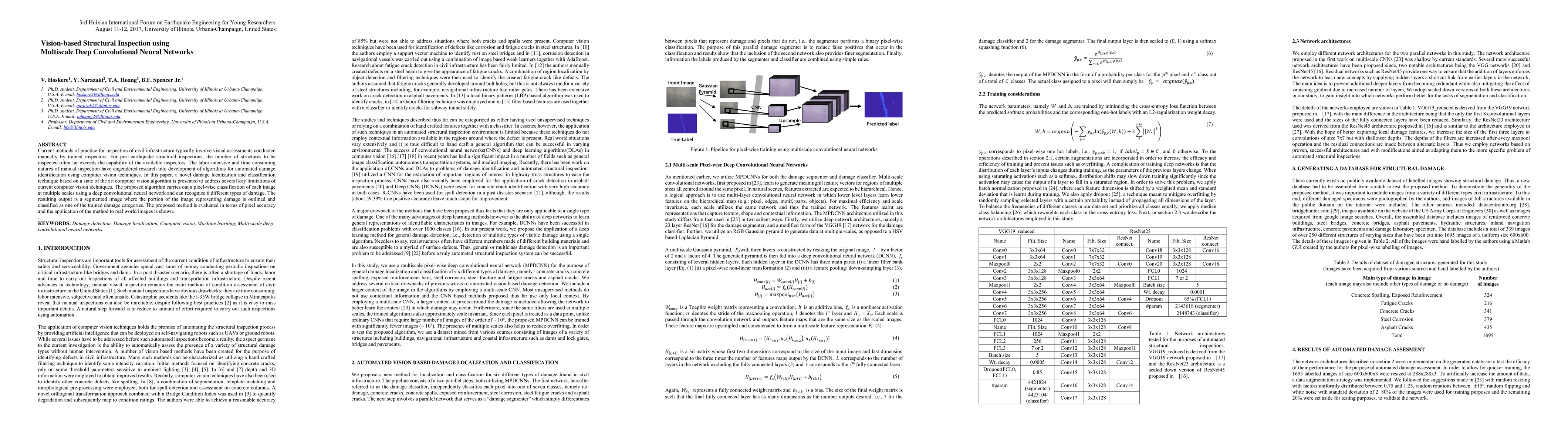 This paper introduces a vision-based structural inspection method using multiscale deep convolutional neural networks to automate damage identification in civil infrastructure. The proposed algorithm performs pixel-wise classification at multiple scales to recognize and localize six types of damage, providing a segmented image with outlined damage areas.