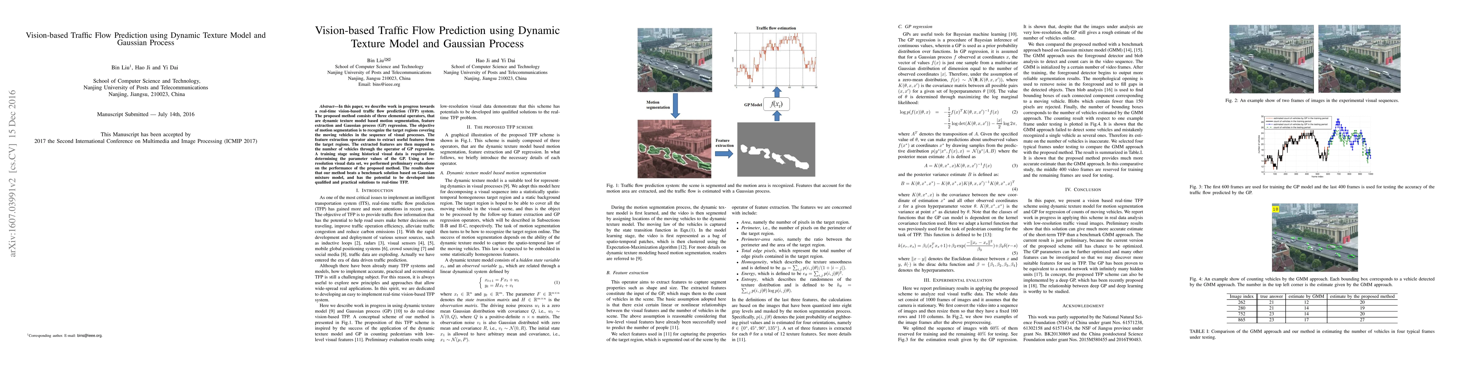 A vision-based traffic flow prediction system uses a dynamic texture model, feature extraction, and Gaussian process to predict traffic flow in real-time. The proposed method outperforms a benchmark solution using a Gaussian mixture model.