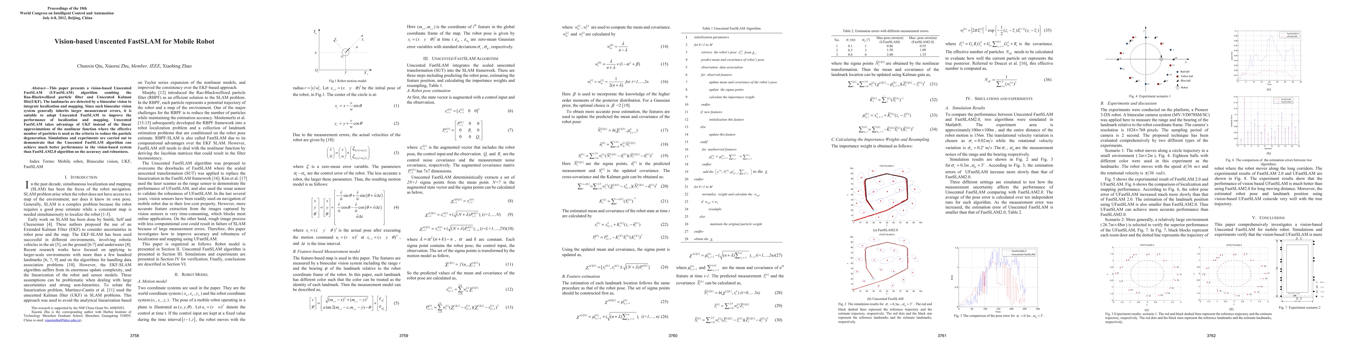 This paper introduces a vision-based Unscented FastSLAM algorithm that combines Rao-Blackwellized particle filtering with Unscented Kalman filtering to enhance localization and mapping using binocular vision. The method outperforms FastSLAM2.0 in accuracy and robustness due to its use of Unscented Kalman filtering to handle nonlinear functions.