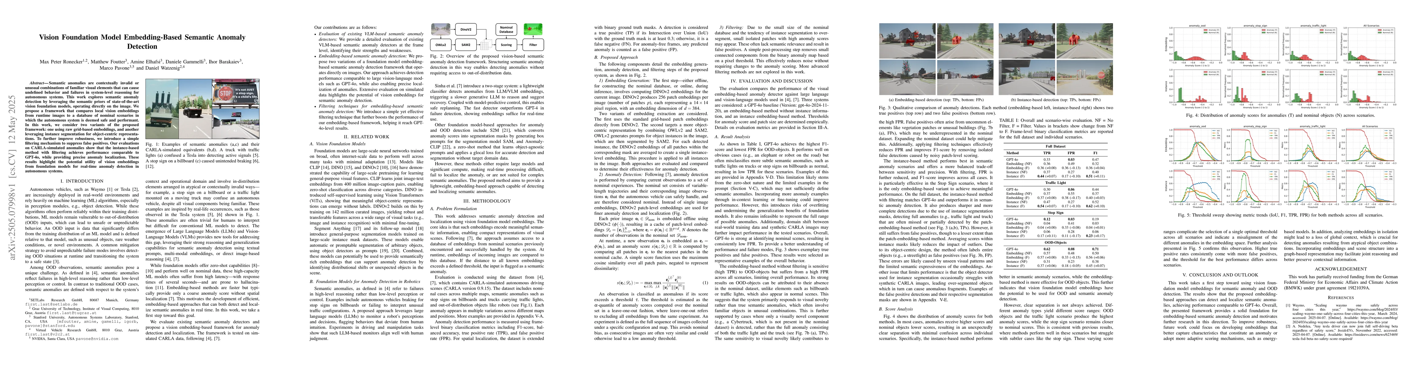 The paper presents a novel framework for semantic anomaly detection using vision foundation model embeddings, combining raw grid-based and instance segmentation-based representations with a filtering mechanism for improved robustness.